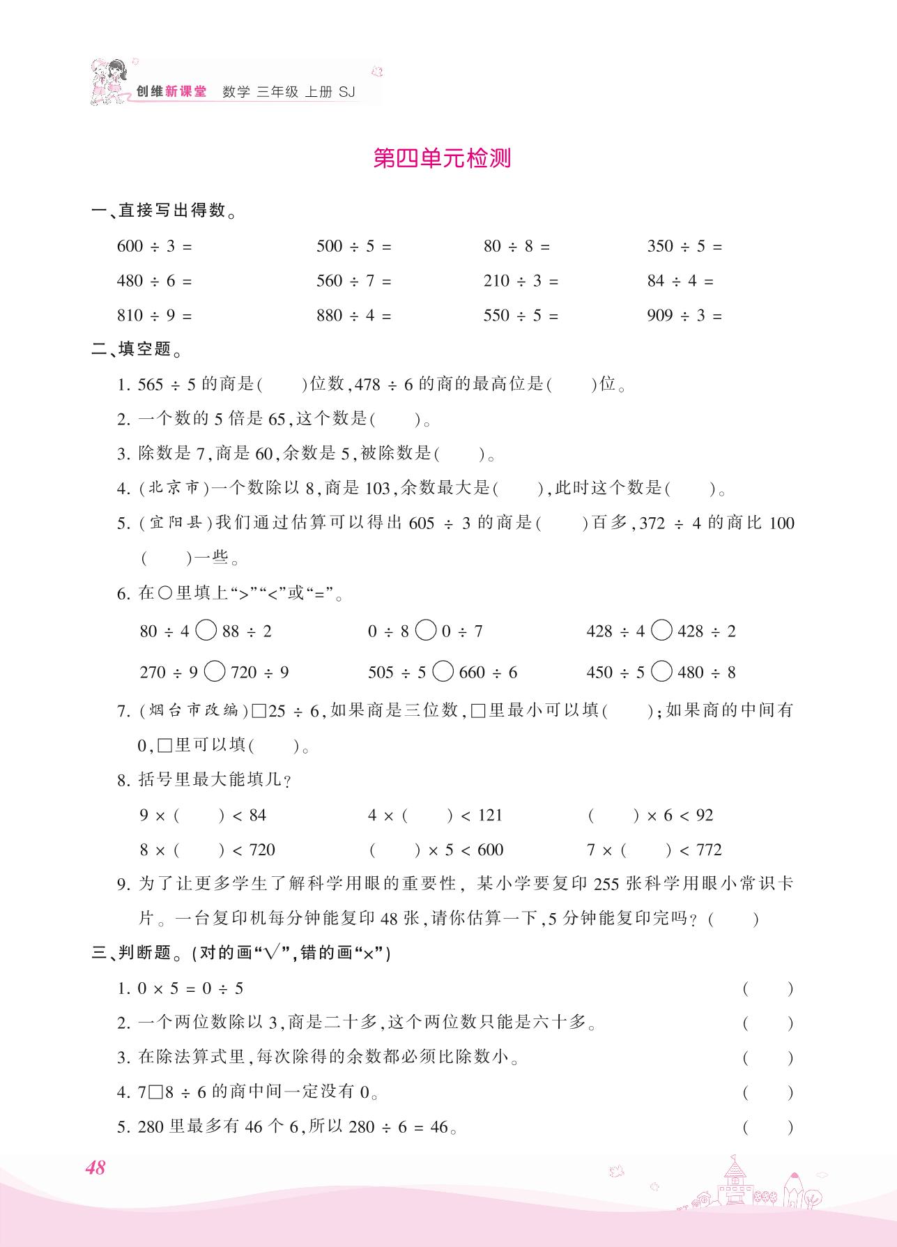 2021上册三年级数学苏教版 四 两、三位数除以一位数——第四单元检测