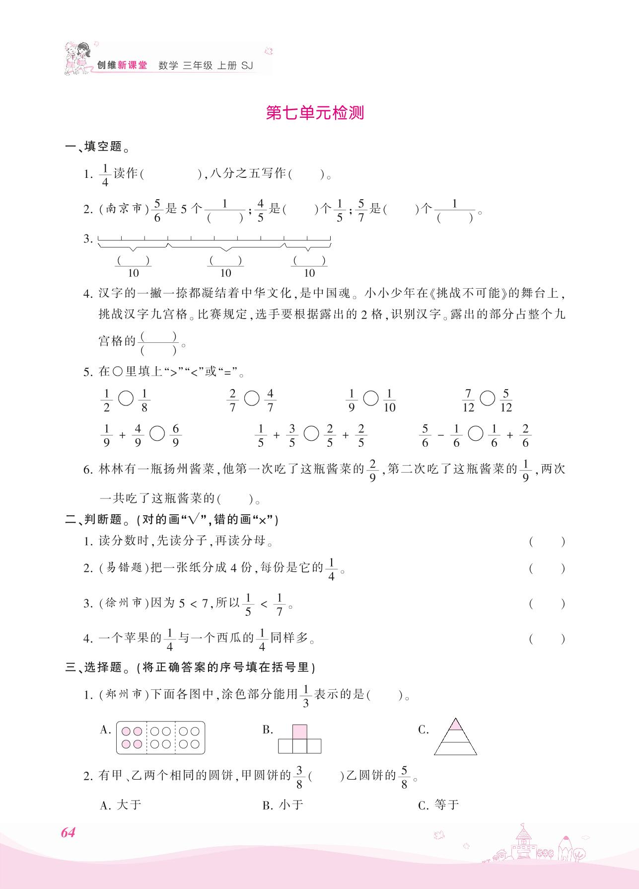 2021上册三年级数学苏教版 七 分数的初步认识(一)——第七单元检测