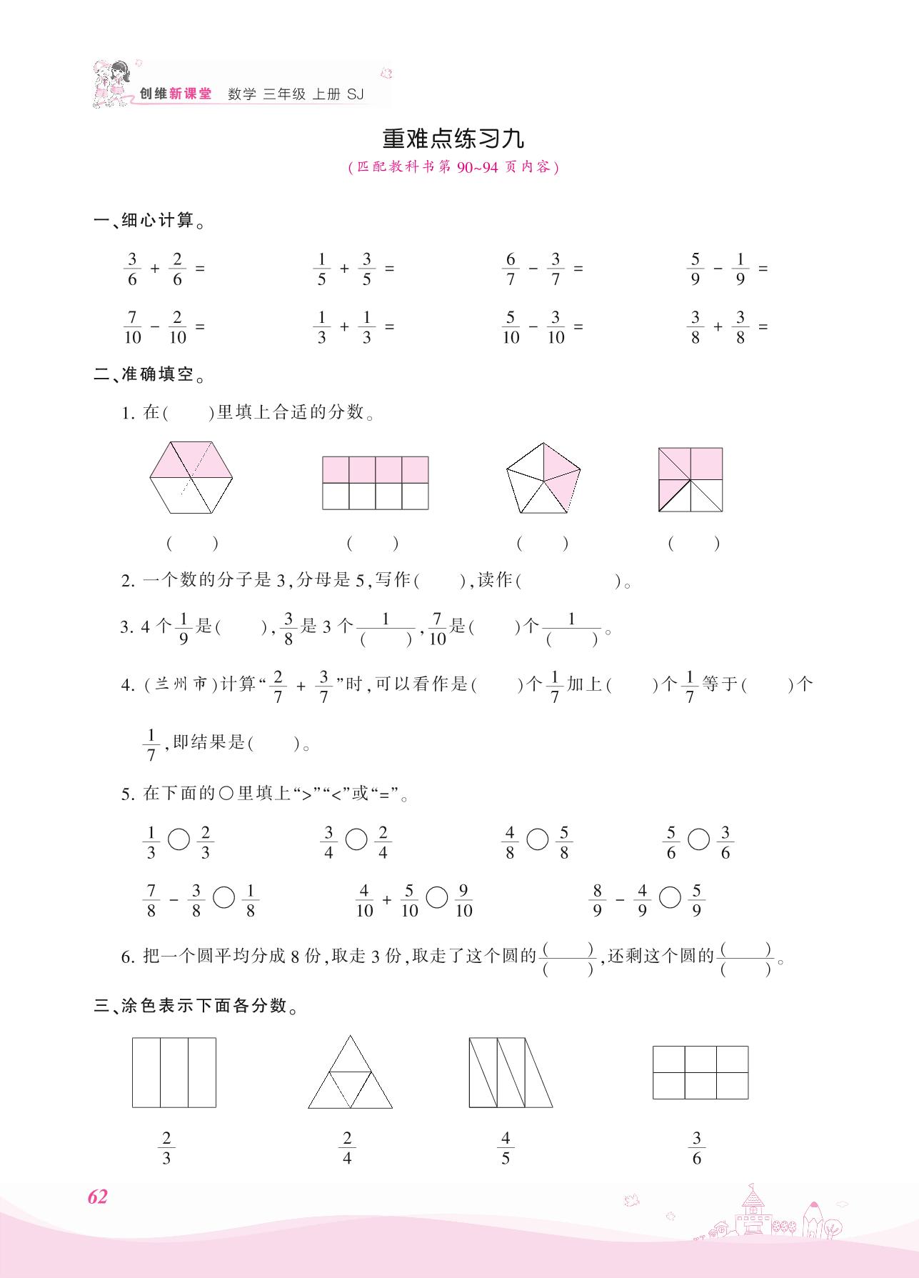 2021上册三年级数学苏教版 七 分数的初步认识(一)——重难点练习九