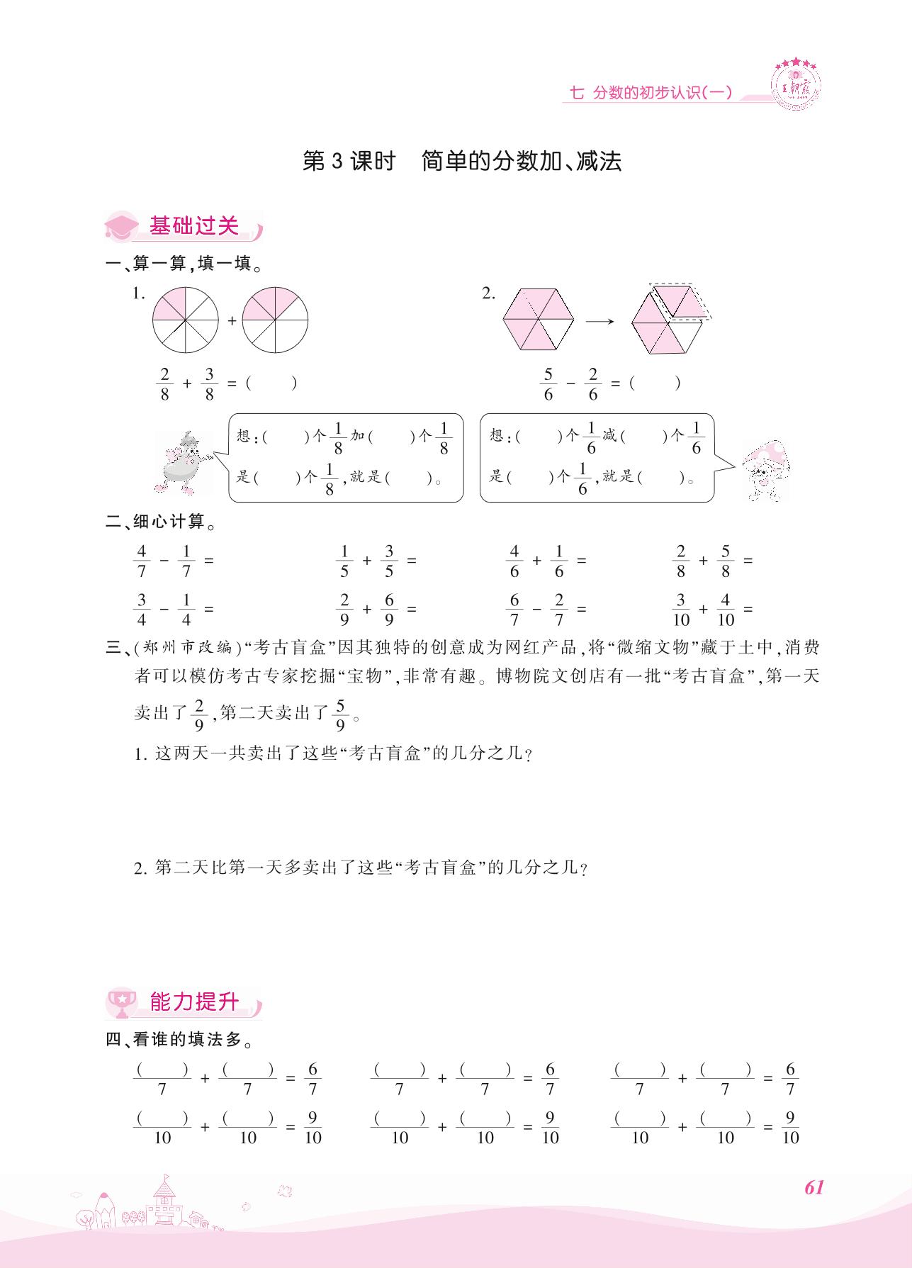2021上册三年级数学苏教版 七 分数的初步认识(一)——第3课时 简单的分数加、减法