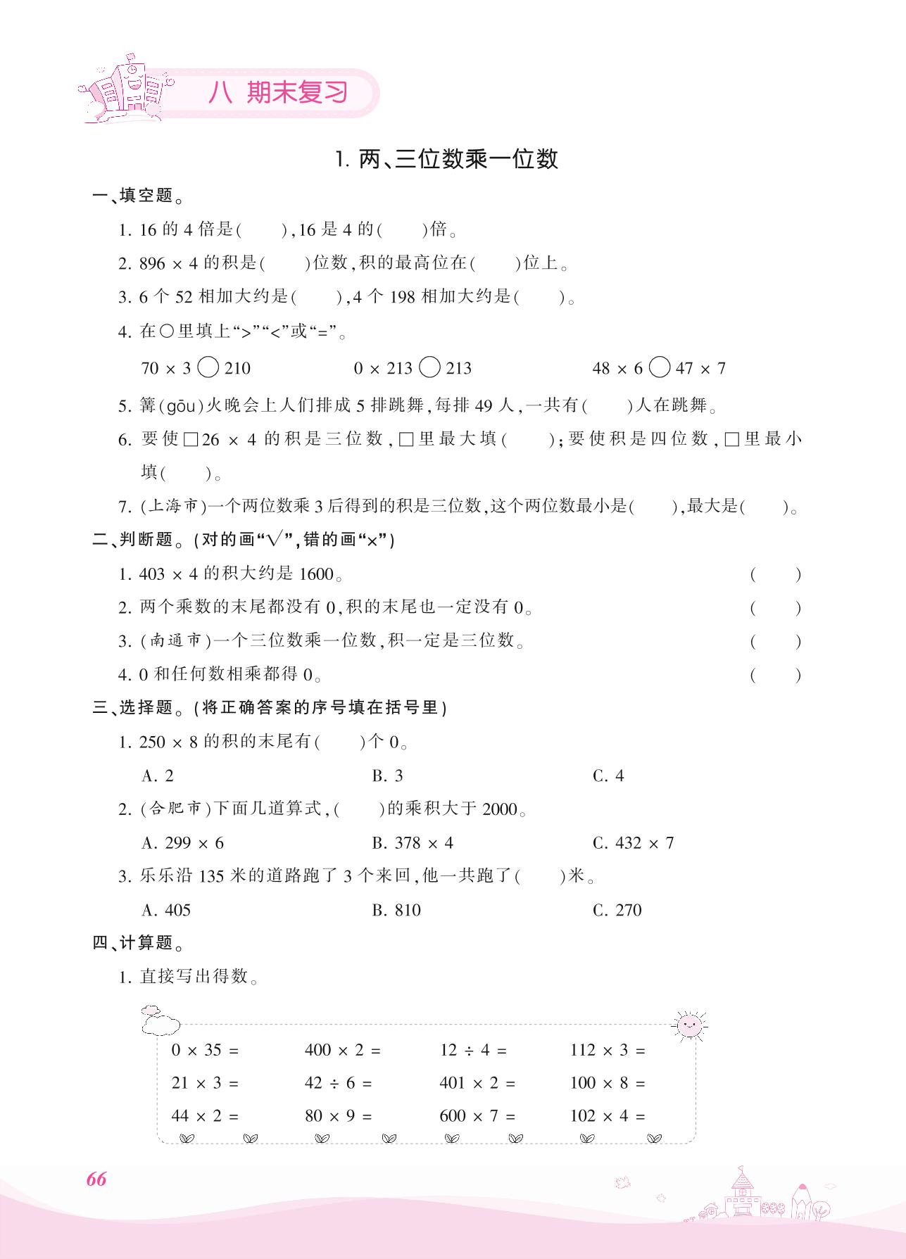 2021上册三年级数学苏教版 八 期末复习——1. 两、三位数乘一位数