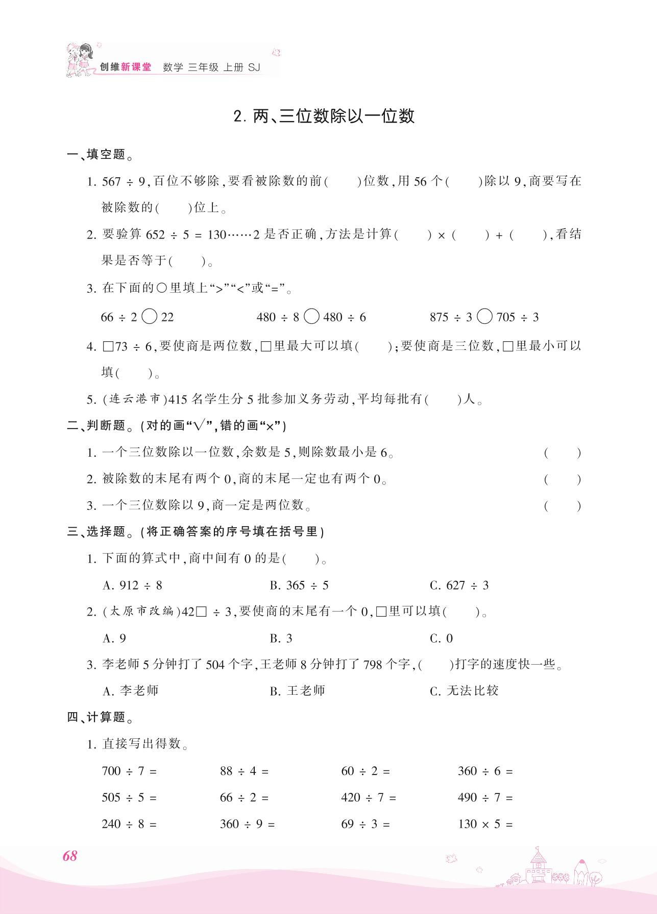 2021上册三年级数学苏教版 八 期末复习——2. 两、三位数除以一位数