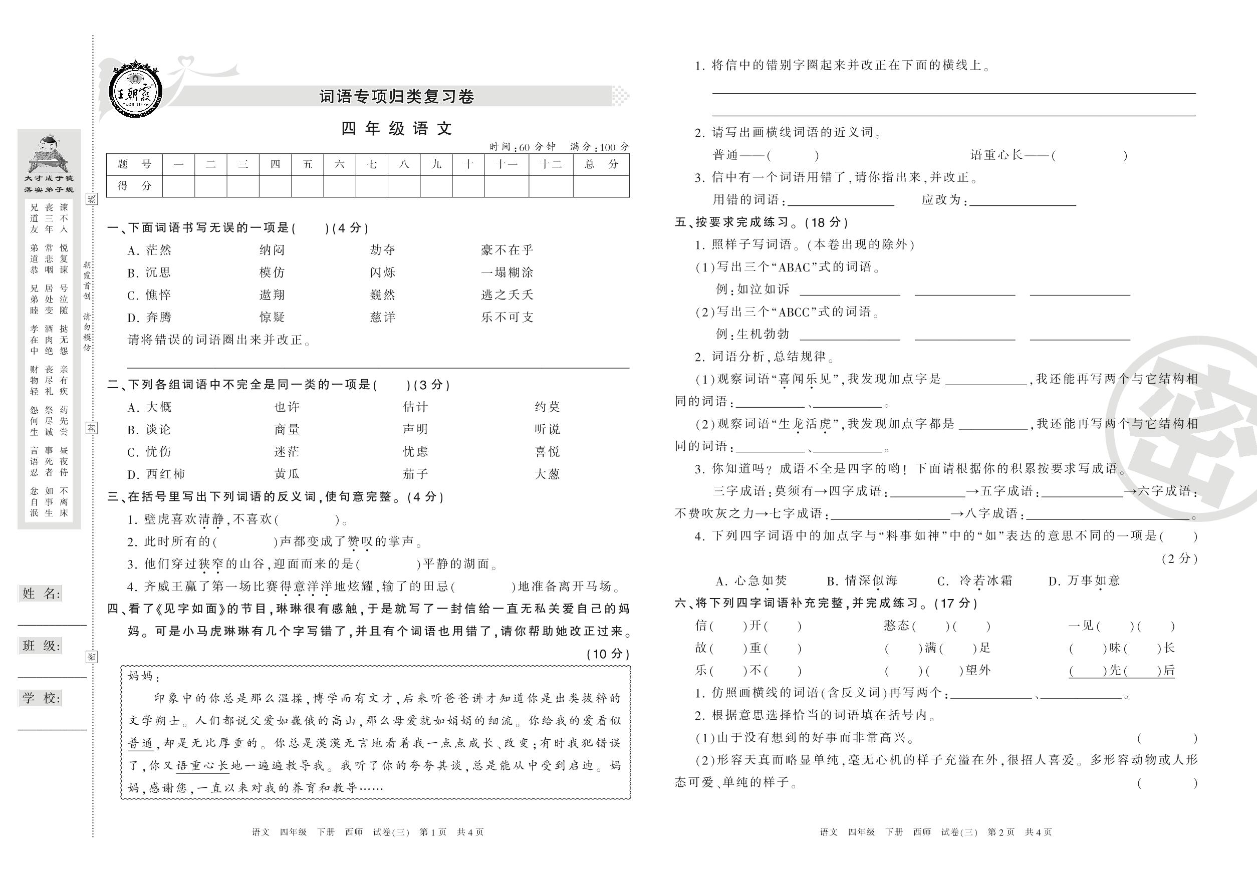 王朝霞期末专项卷四年级下册语文(西师版)_R210801211330【3】