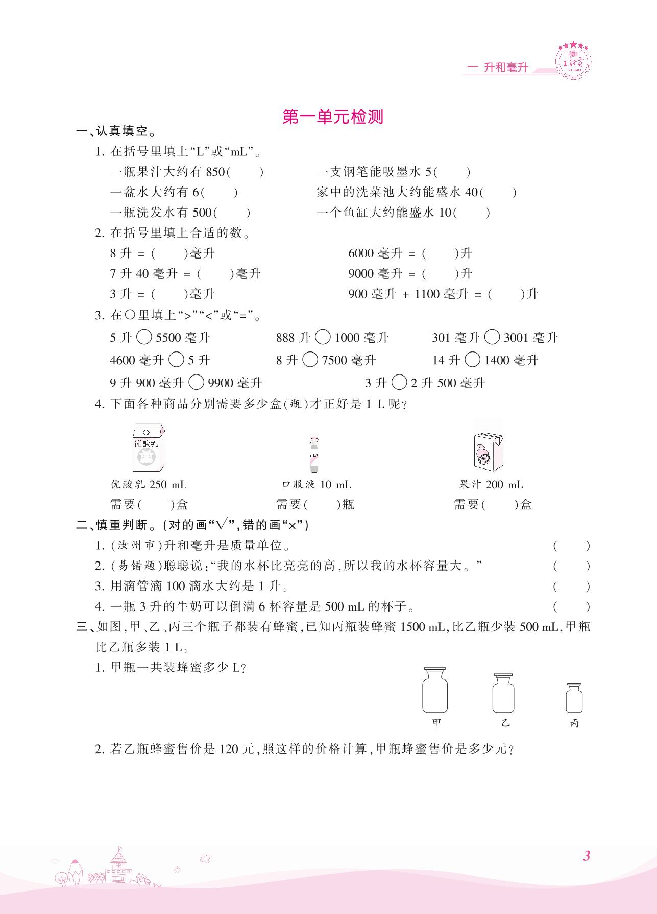 2021上册四年级数学苏教版 一 升和毫升——第一单元检测