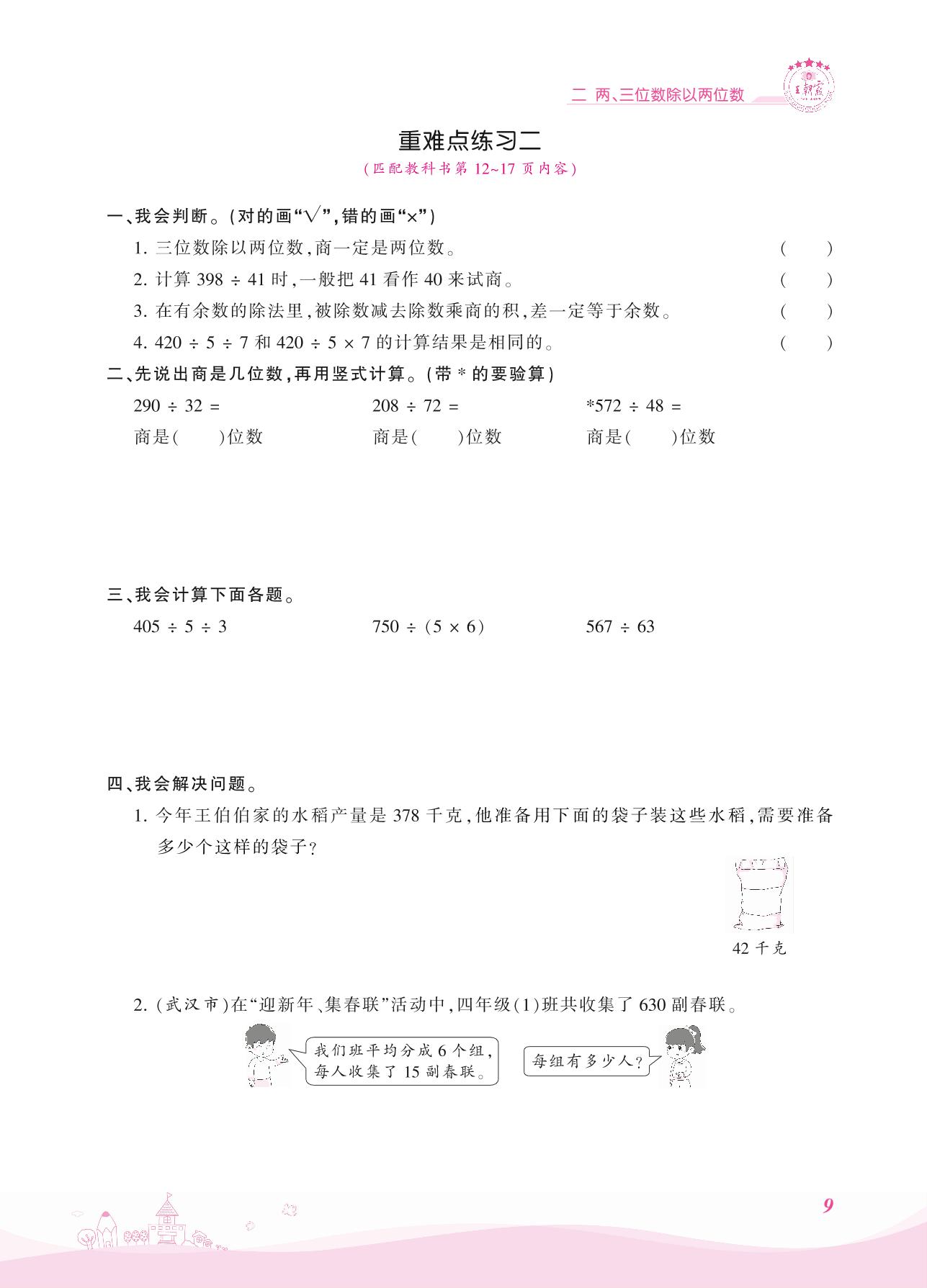 2021上册四年级数学苏教版 二 两、三位数除以两位数——重难点练习二