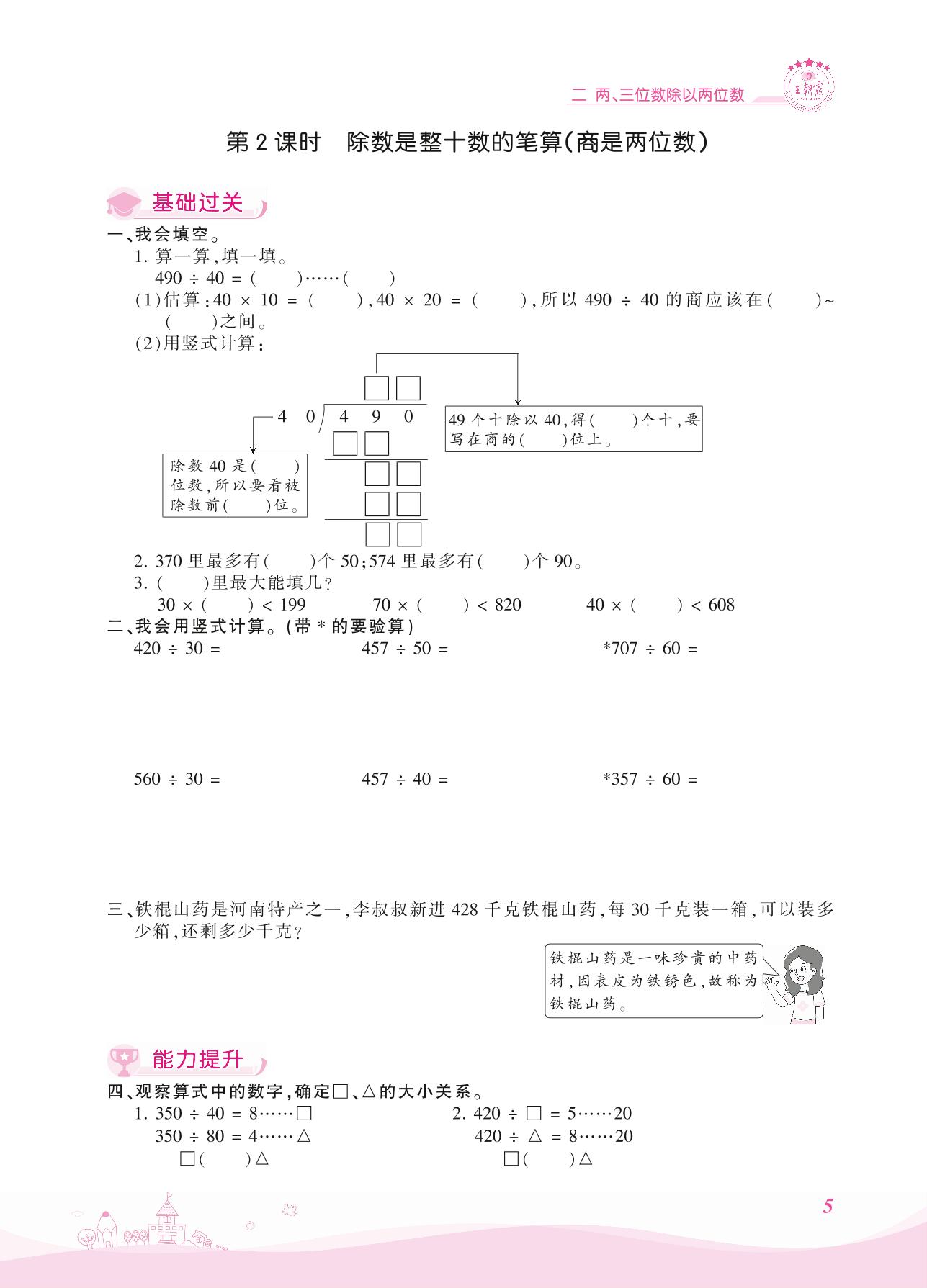 2021上册四年级数学苏教版 二 两、三位数除以两位数——第2课时 除数是整十数的笔算(商是两位数)