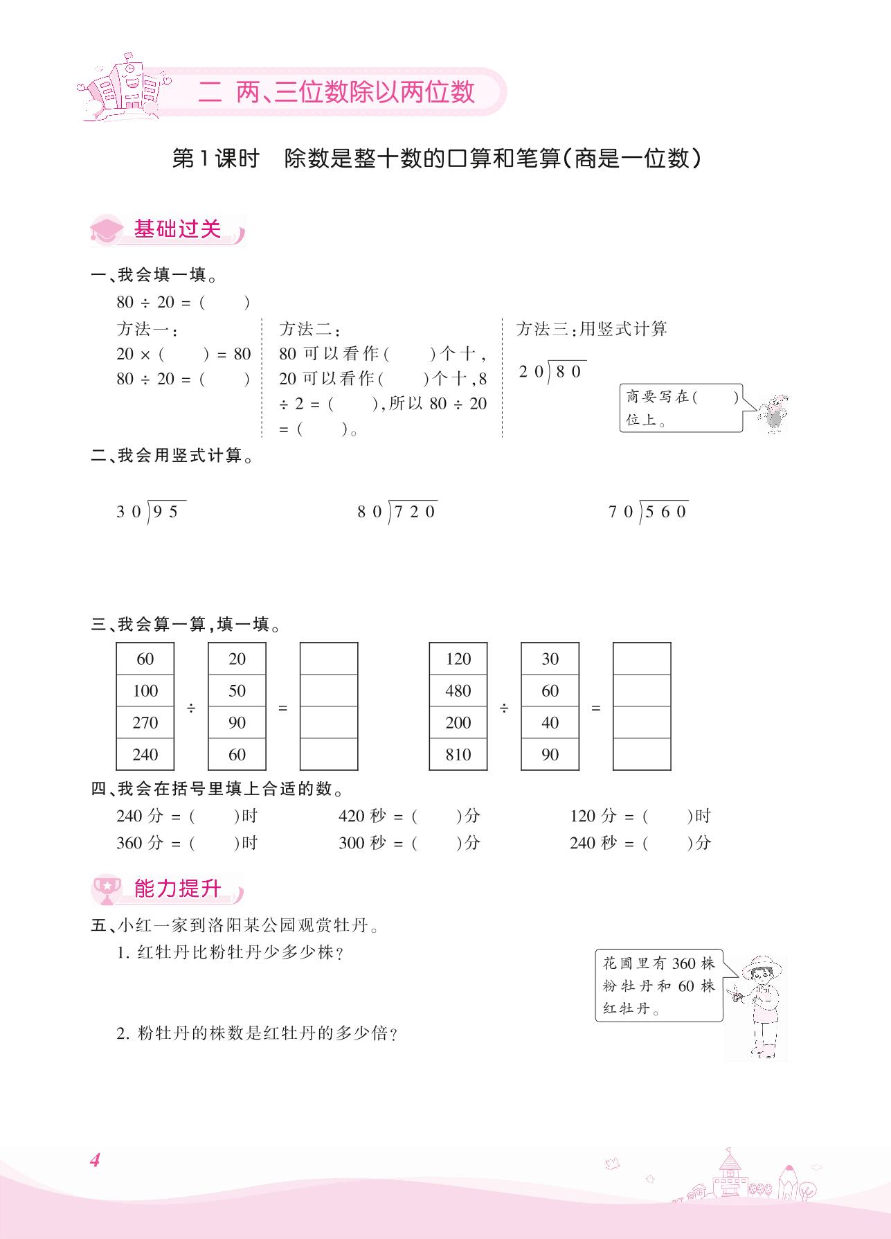2021上册四年级数学苏教版 二 两、三位数除以两位数——第1课时 除数是整十数的口算和笔算(商是一位数)