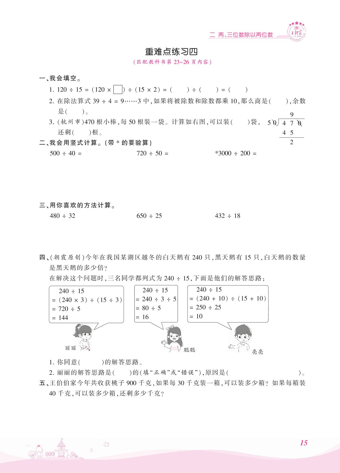 2021上册四年级数学苏教版 二 两、三位数除以两位数——重难点练习四