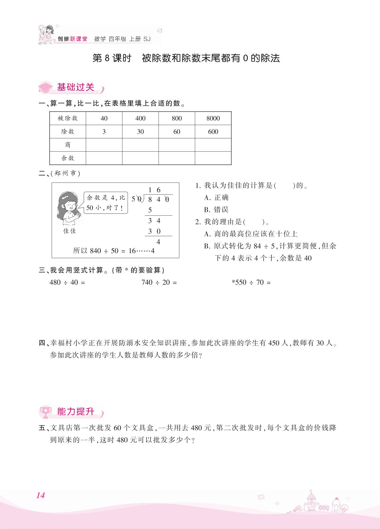 2021上册四年级数学苏教版 二 两、三位数除以两位数——第8课时 被除数和除数末尾都有0的除法