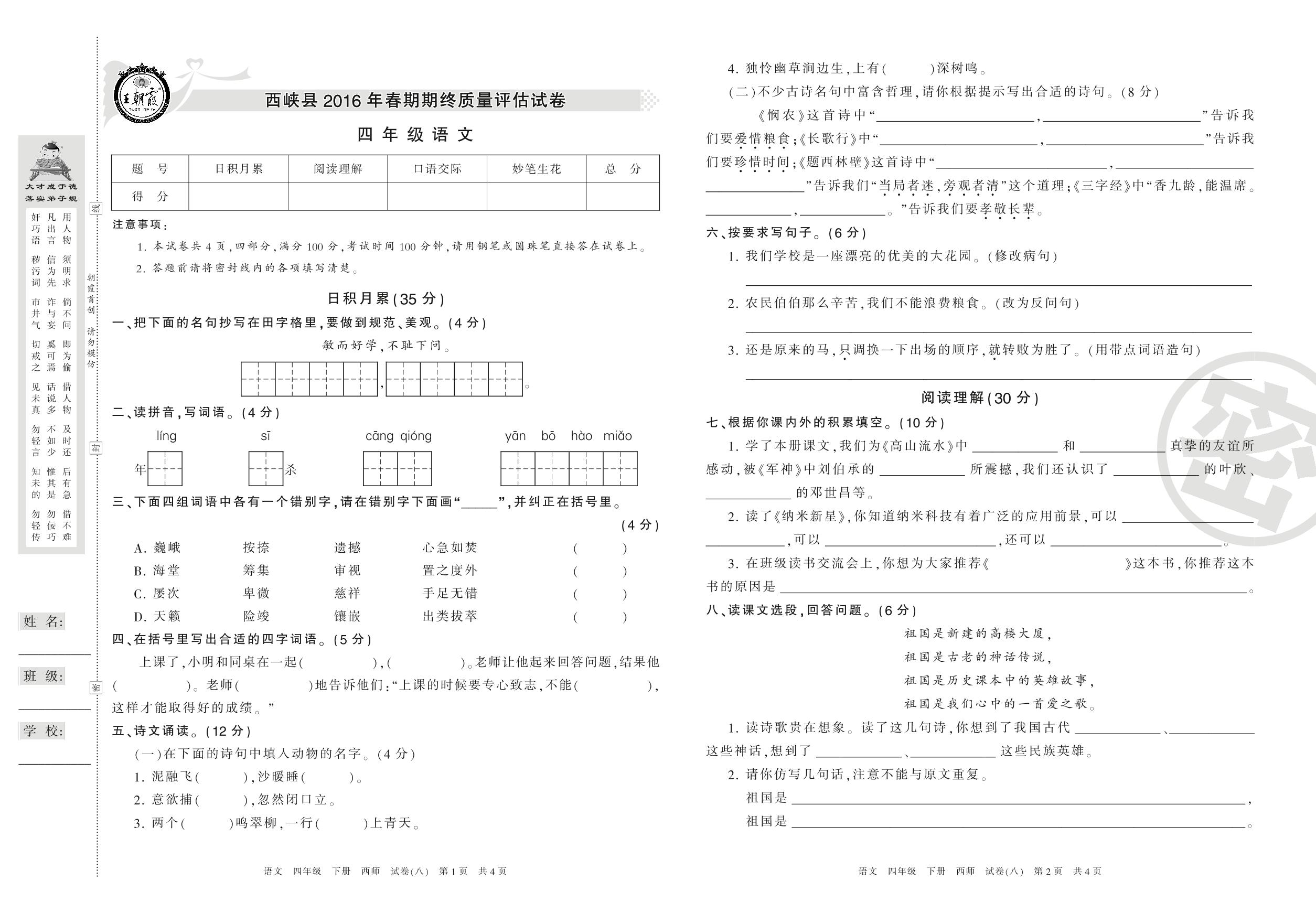 2015-2016学年第二学期南阳市西峡县四年级语文试卷(西师版)【8】