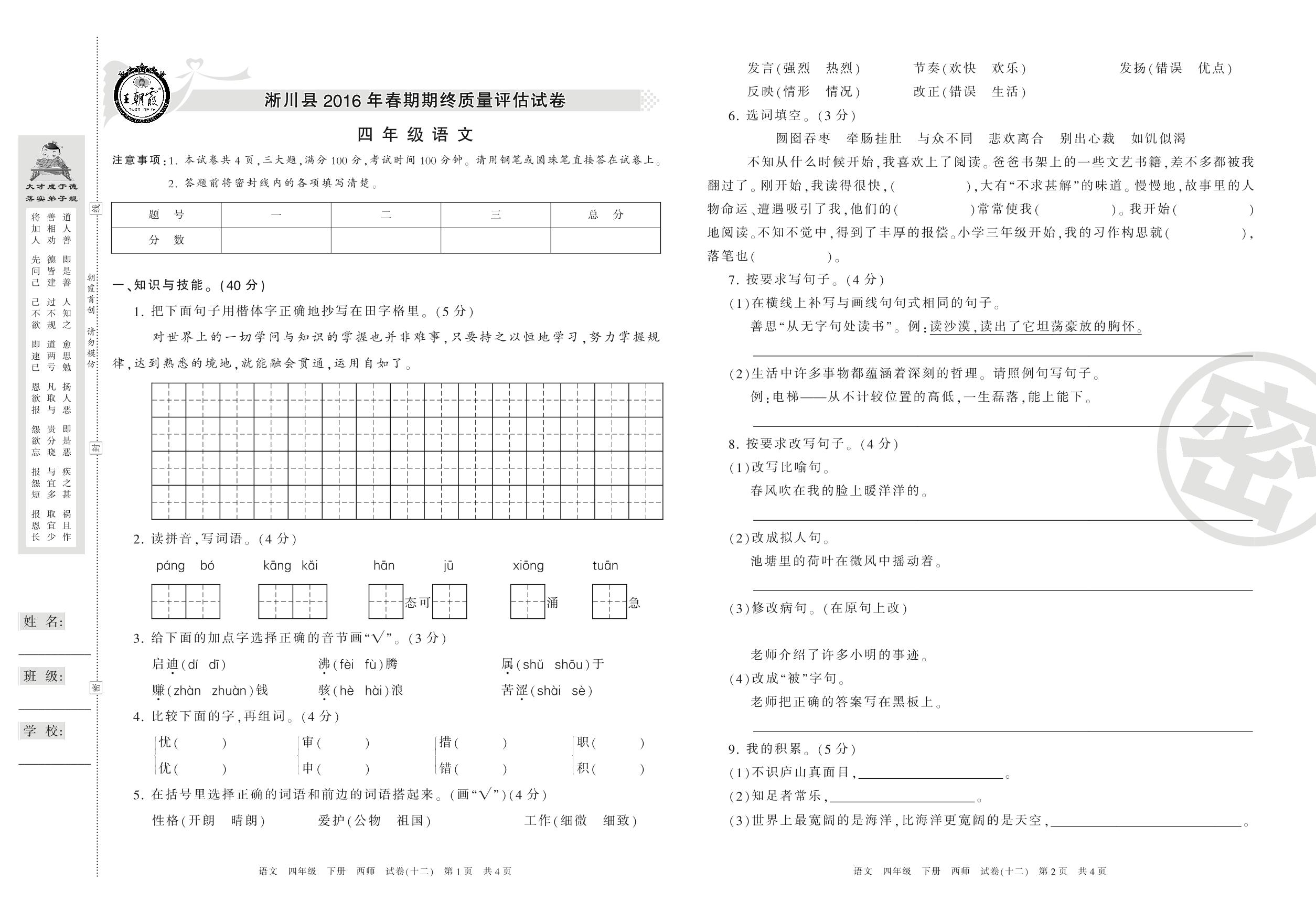 2015-2016学年第二学期南阳市淅川县四年级语文试卷(西师版)【12】