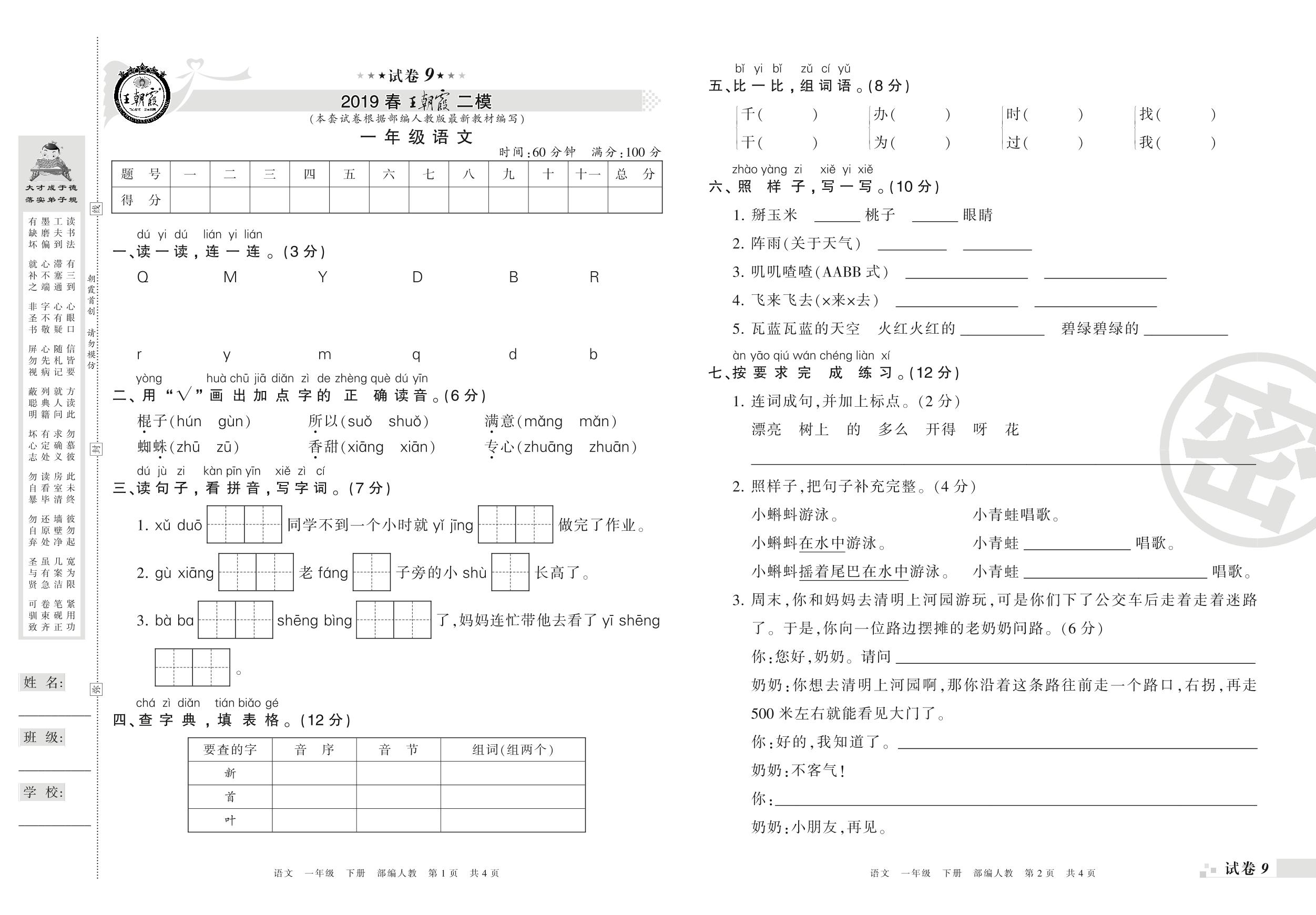王朝霞期末模拟卷一年级下册语文(人教版)_R210731181904【9】