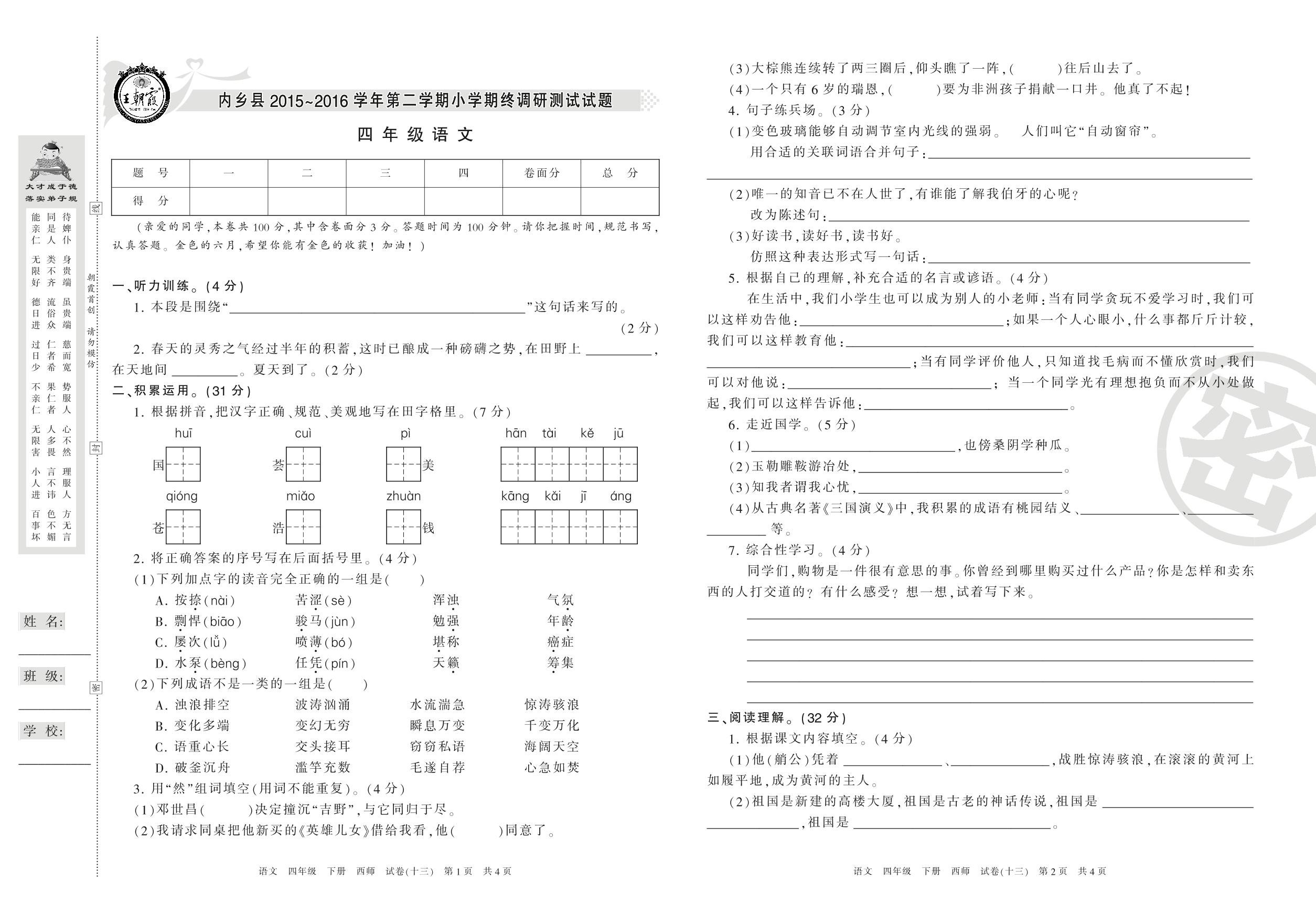 2015-2016学年第二学期南阳市内乡县四年级语文试卷(西师版)【13】