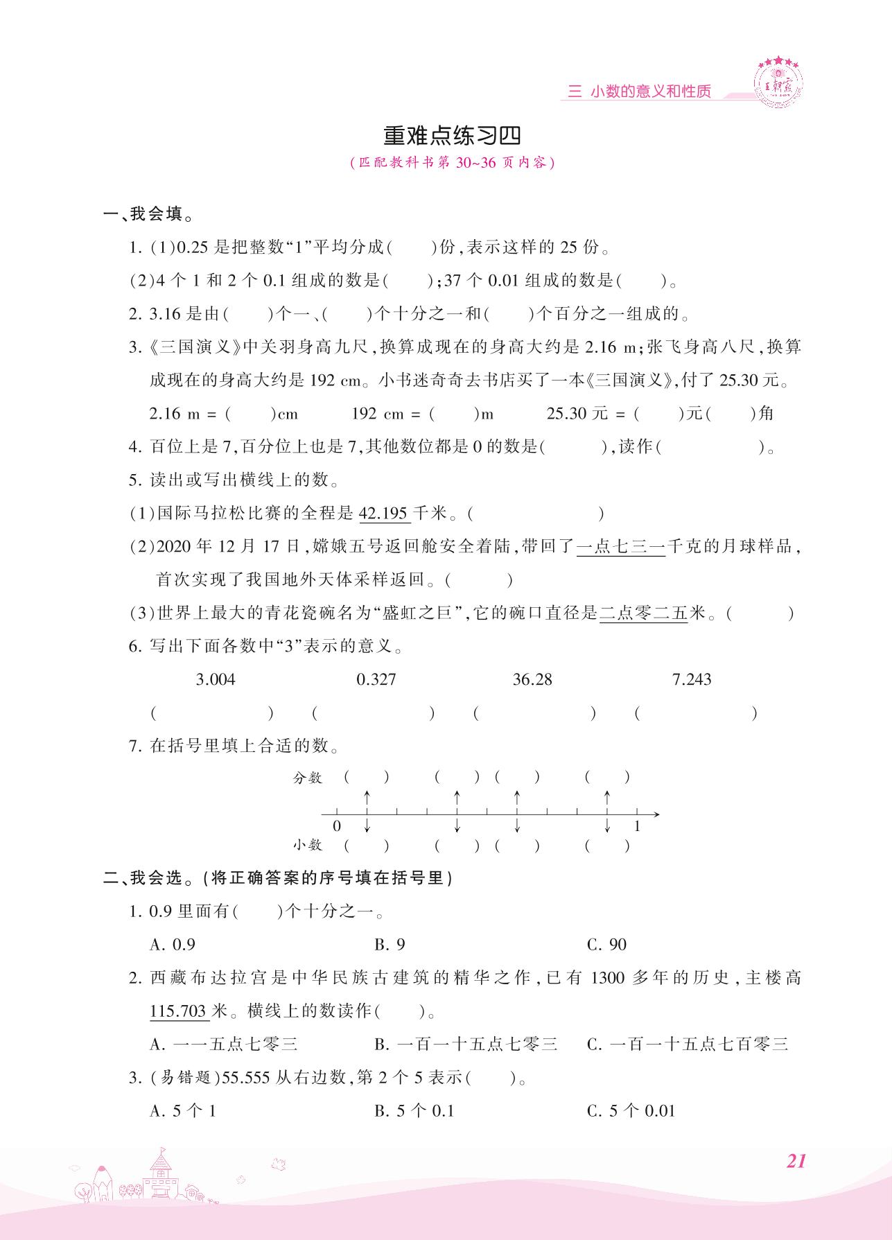 2021上册五年级数学苏教版 三 小数的意义和性质——重难点练习四