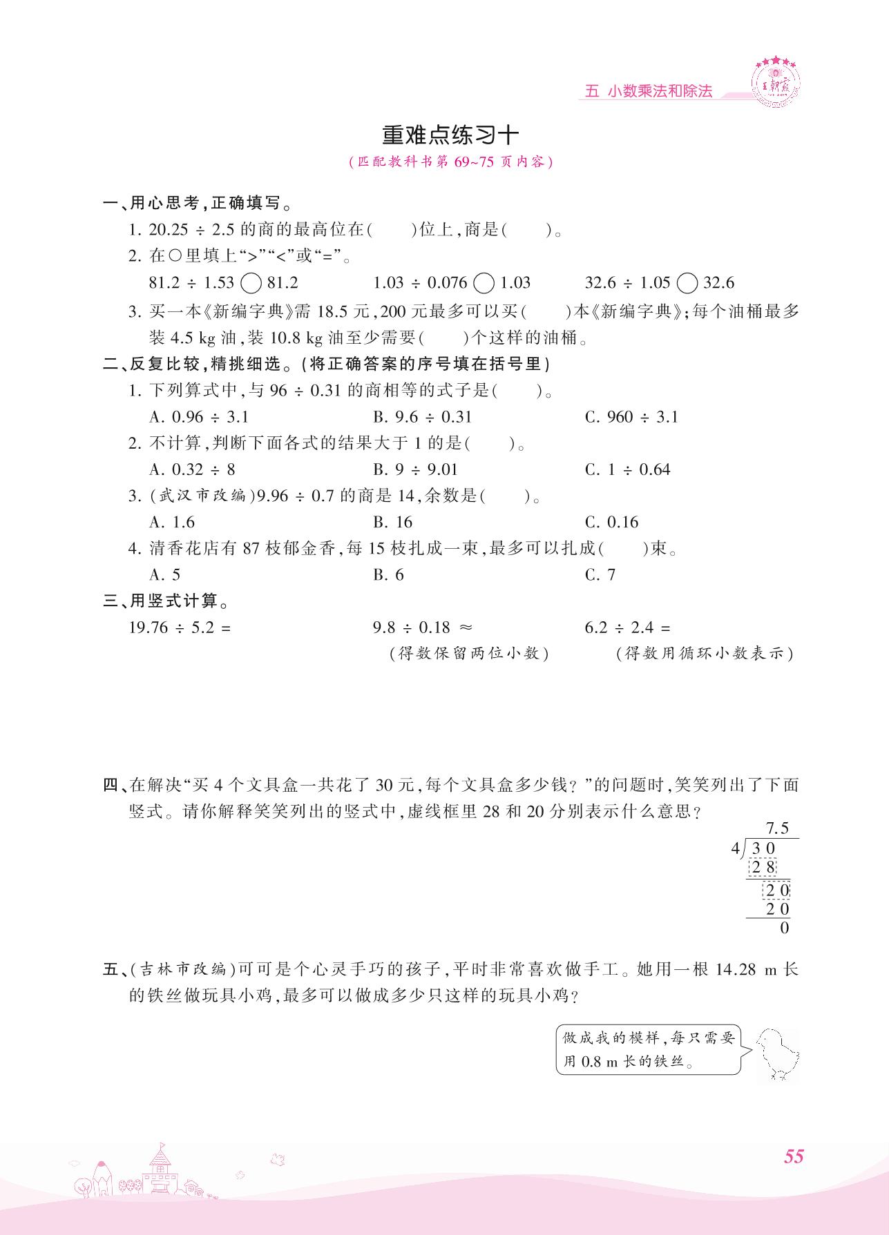 2021上册五年级数学苏教版 五 小数乘法和除法——重难点练习十