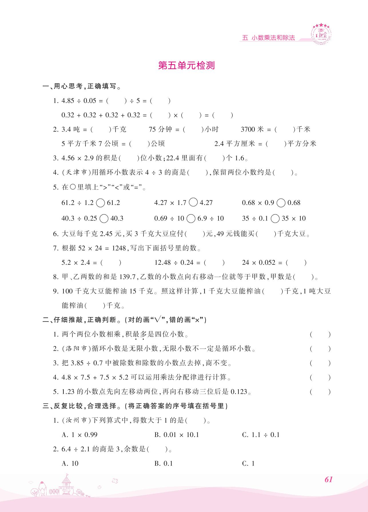 2021上册五年级数学苏教版 五 小数乘法和除法——第五单元检测