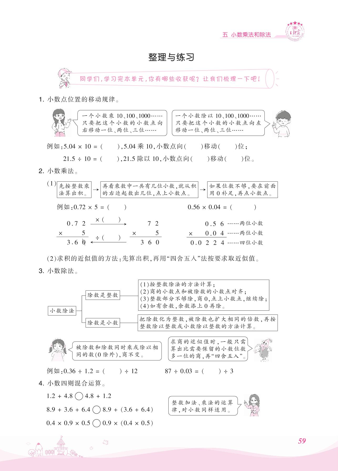 2021上册五年级数学苏教版 五 小数乘法和除法——整理与练习