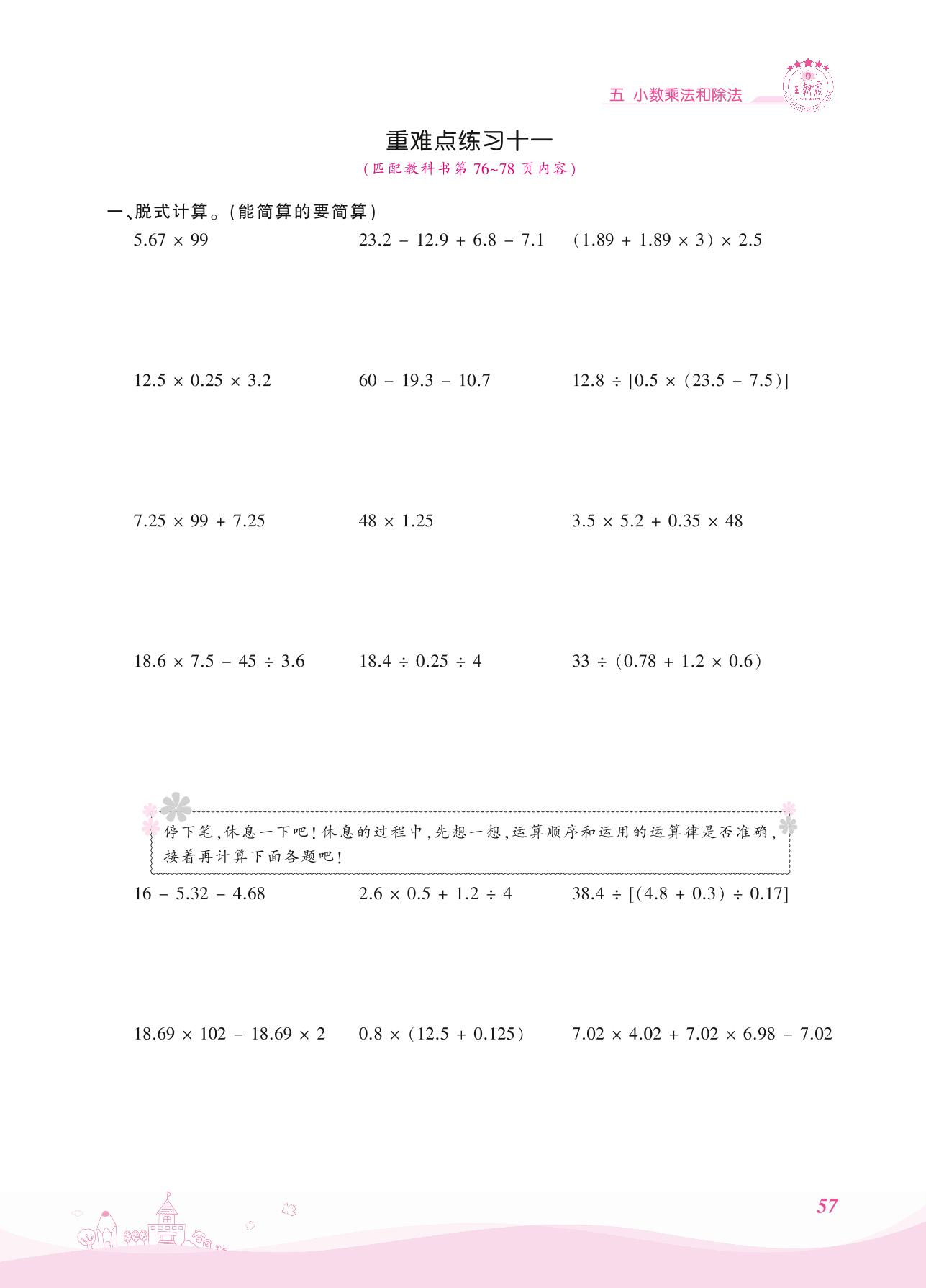 2021上册五年级数学苏教版 五 小数乘法和除法——重难点练习十一