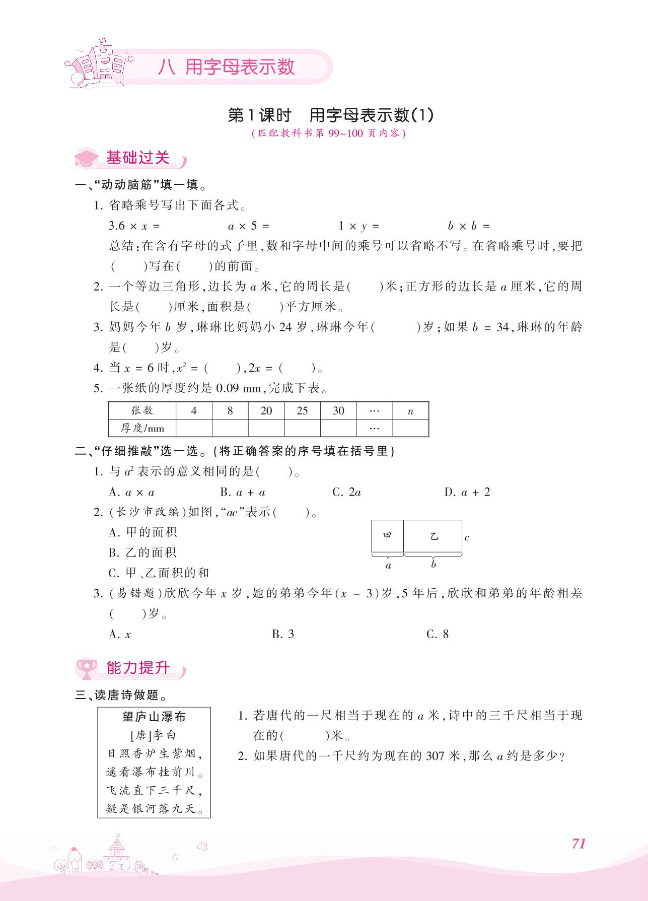 2021上册五年级数学苏教版 八 用字母表示数——第1课时 用字母表示数(1)