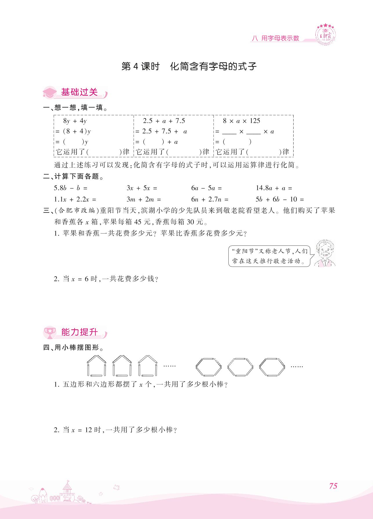 2021上册五年级数学苏教版 八 用字母表示数——第4课时 化简含有字母的式子
