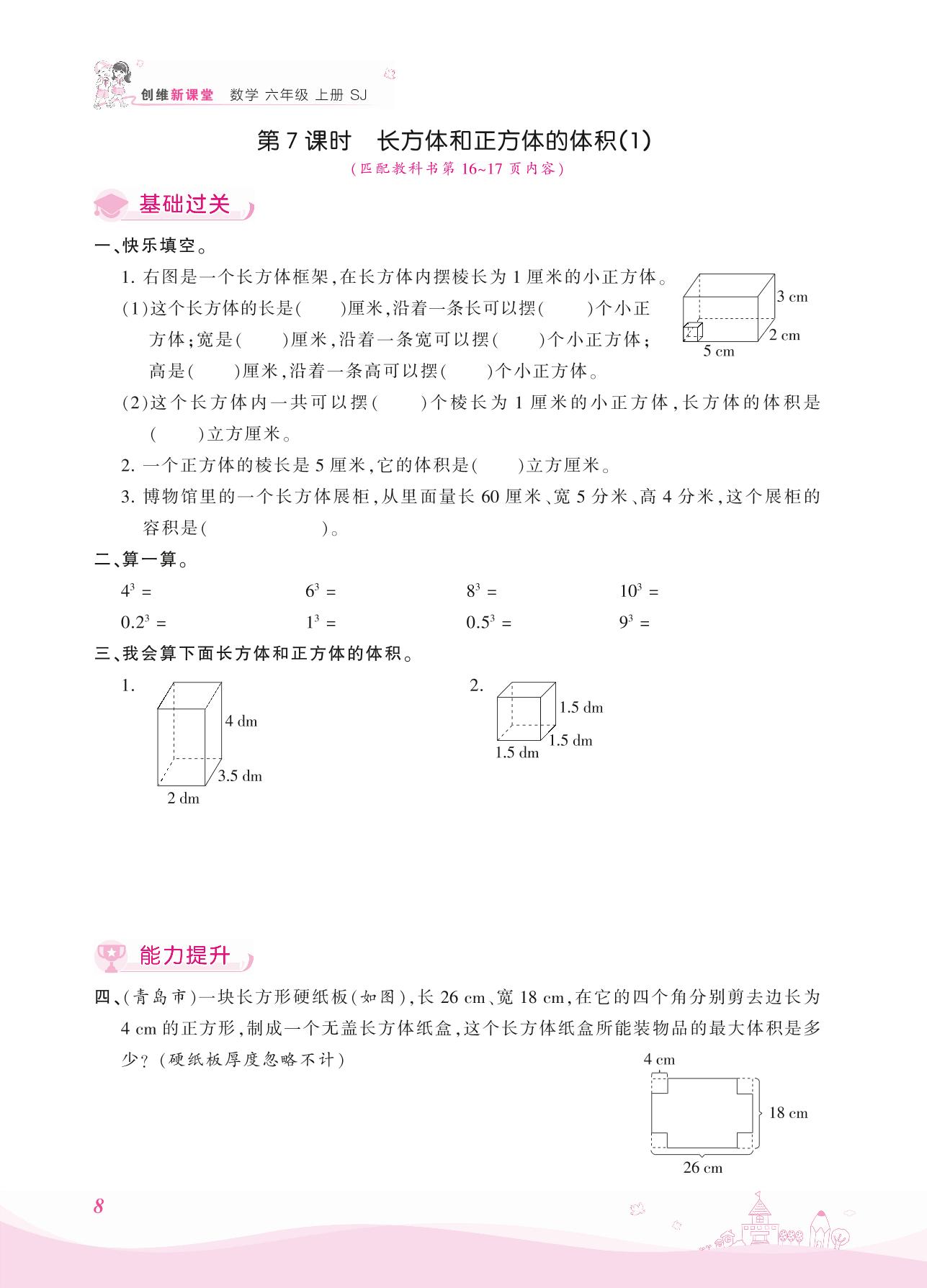 2021上册六年级数学苏教版 一 长方体和正方体——第7课时 长方体和正方体的体积(1)