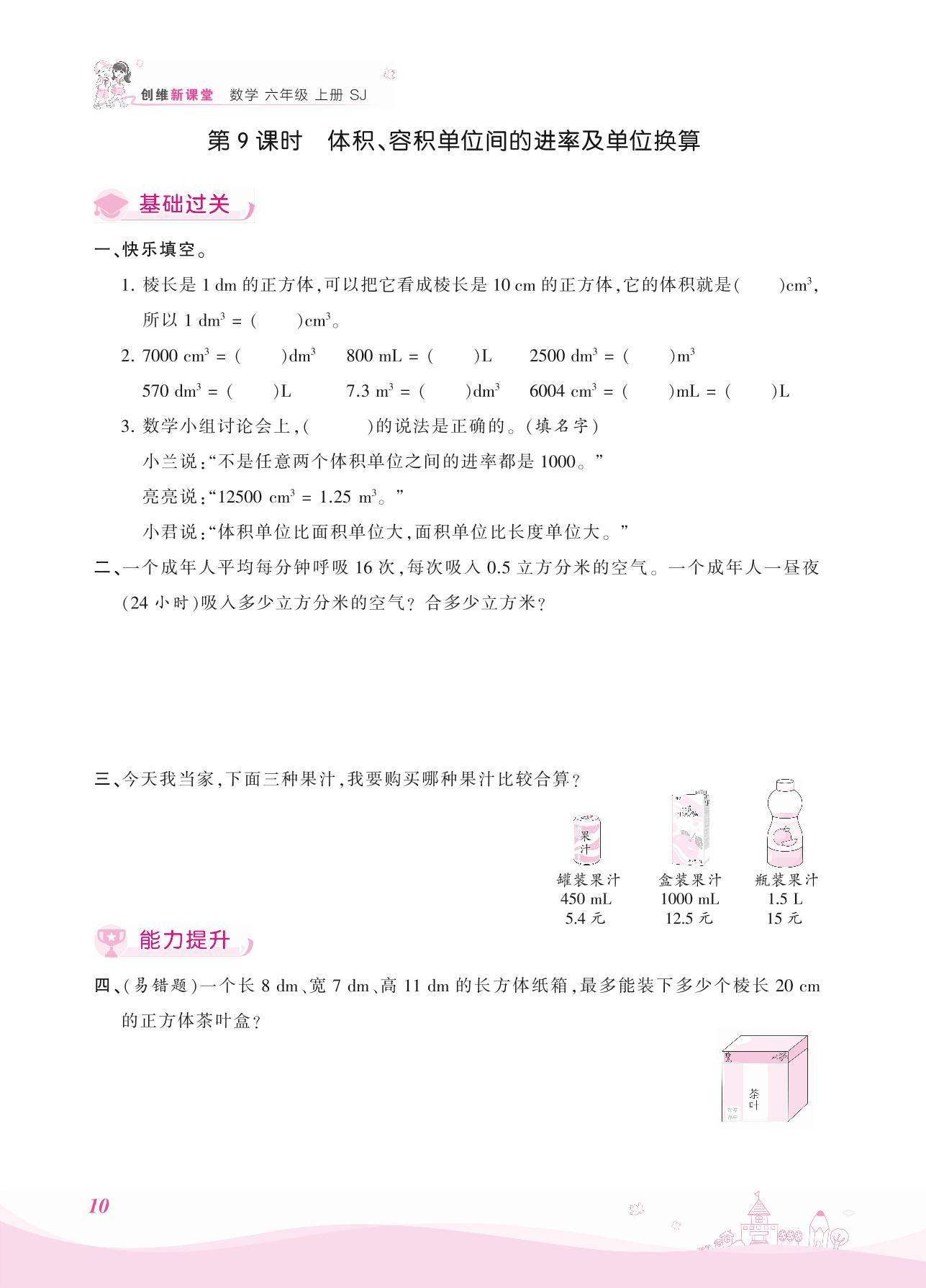 2021上册六年级数学苏教版 一 长方体和正方体——第9课时 体积、容积单位间的进率及单位换算
