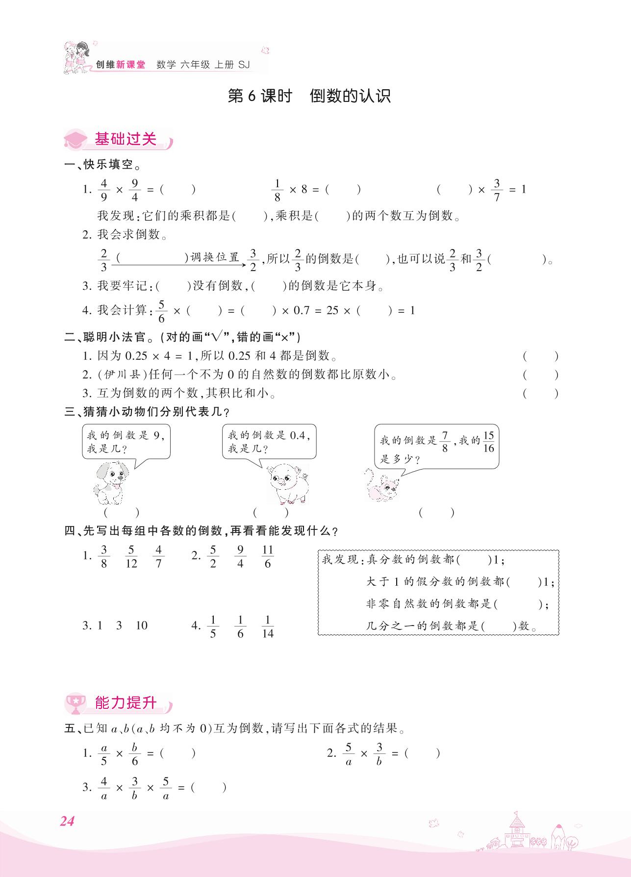 2021上册六年级数学苏教版 二 分数乘法——第6课时 倒数的认识