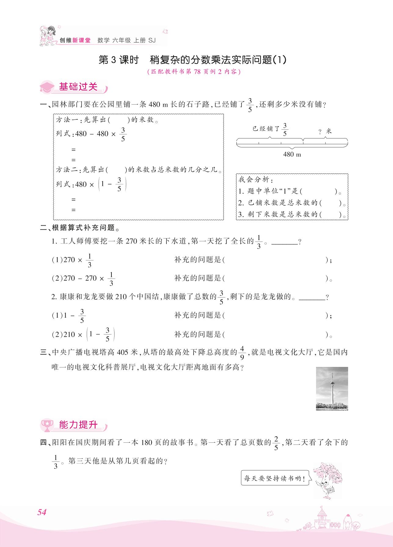2021上册六年级数学苏教版 五 分数四则混合运算——第3课时 稍复杂的分数乘法实际问题(1)