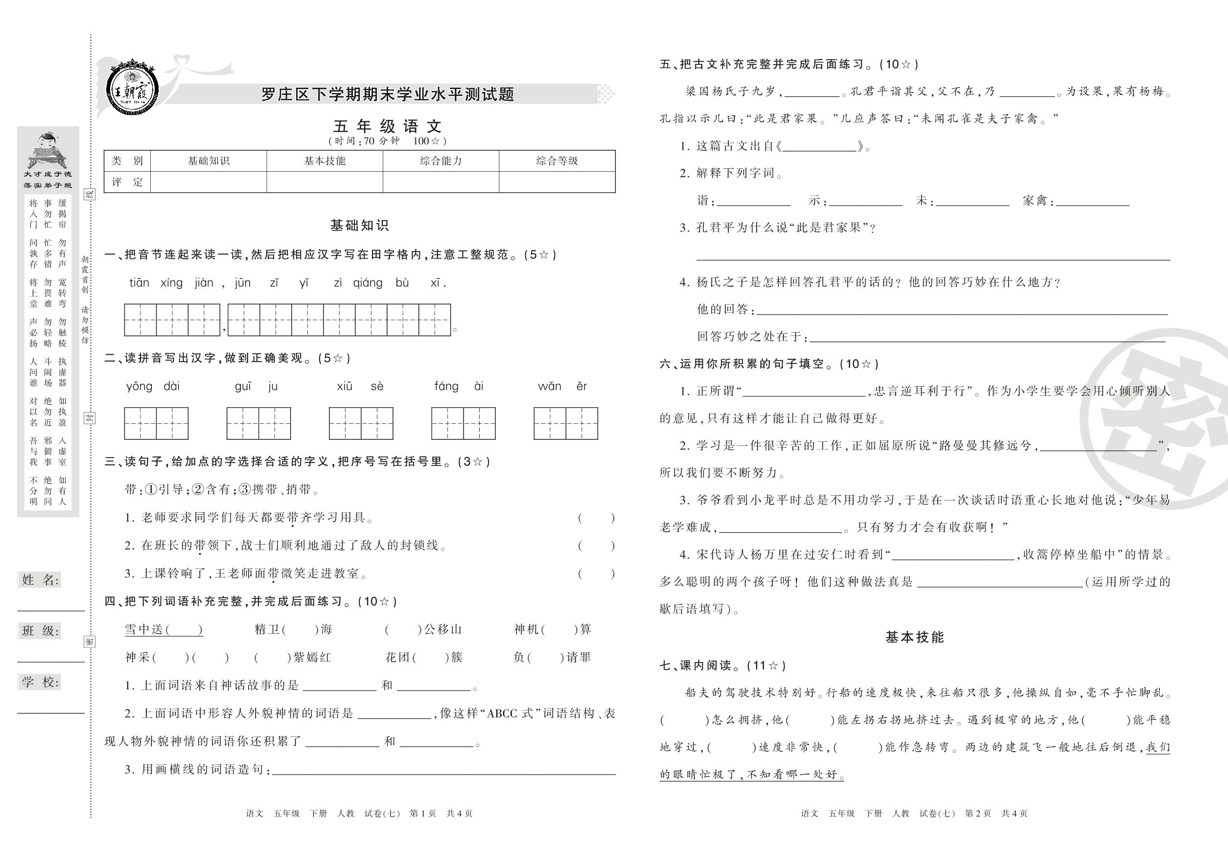2015-2016学年第二学期临沂市罗庄区五年级语文试卷(人教版)【7】