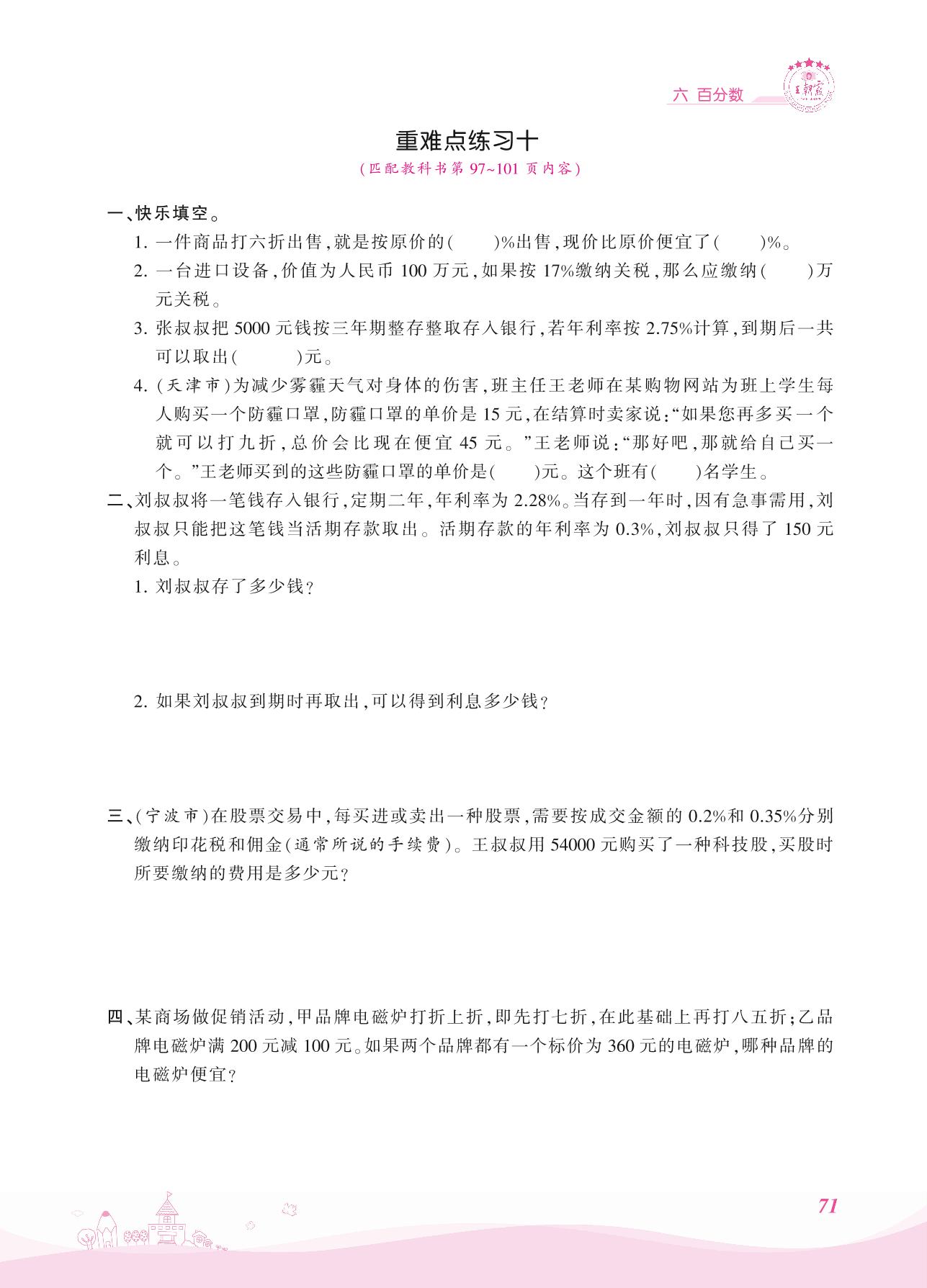 2021上册六年级数学苏教版 六 百分数——重难点练习十