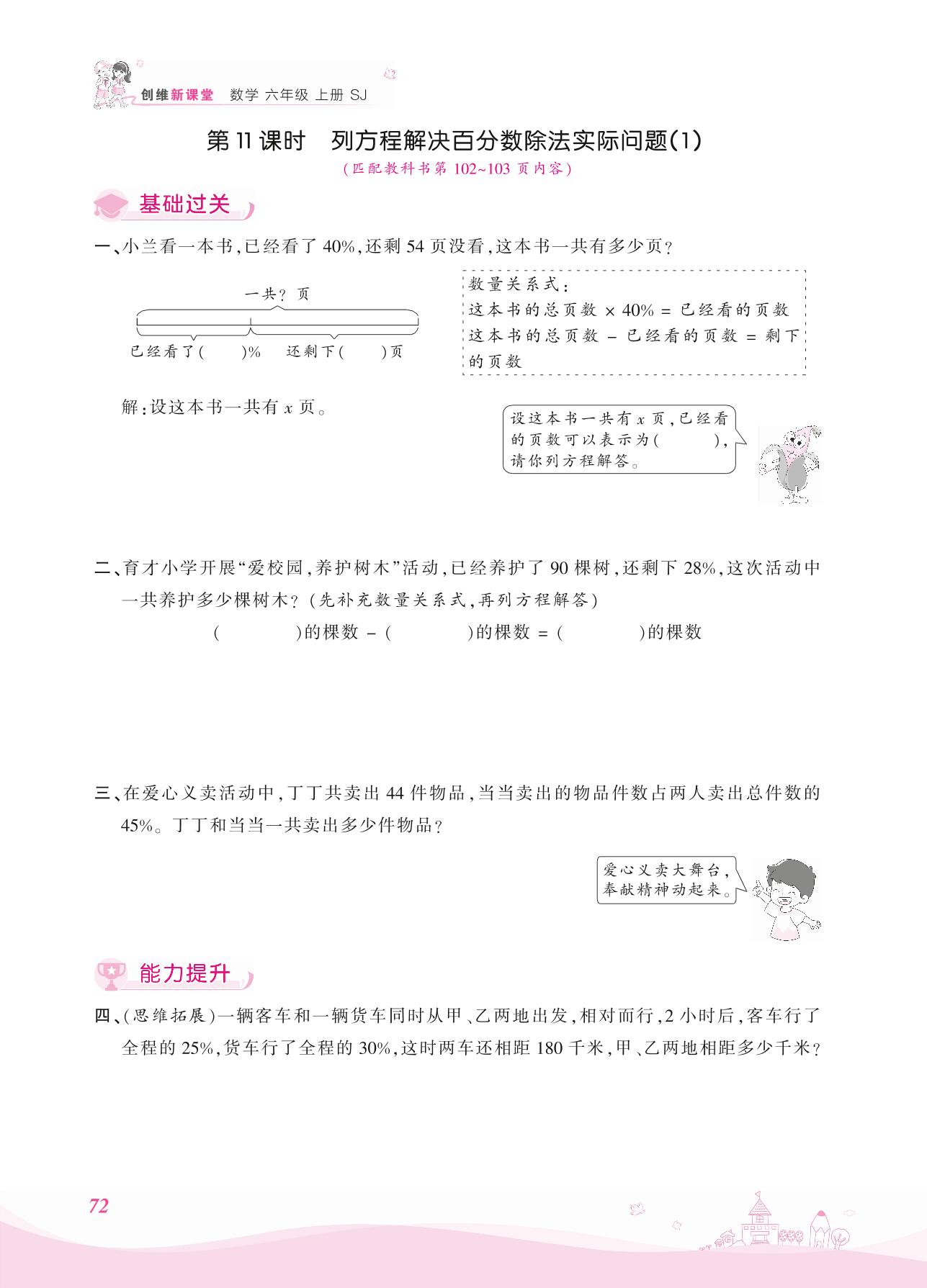 2021上册六年级数学苏教版 六 百分数——第11课时 列方程解决百分数除法实际问题(1)