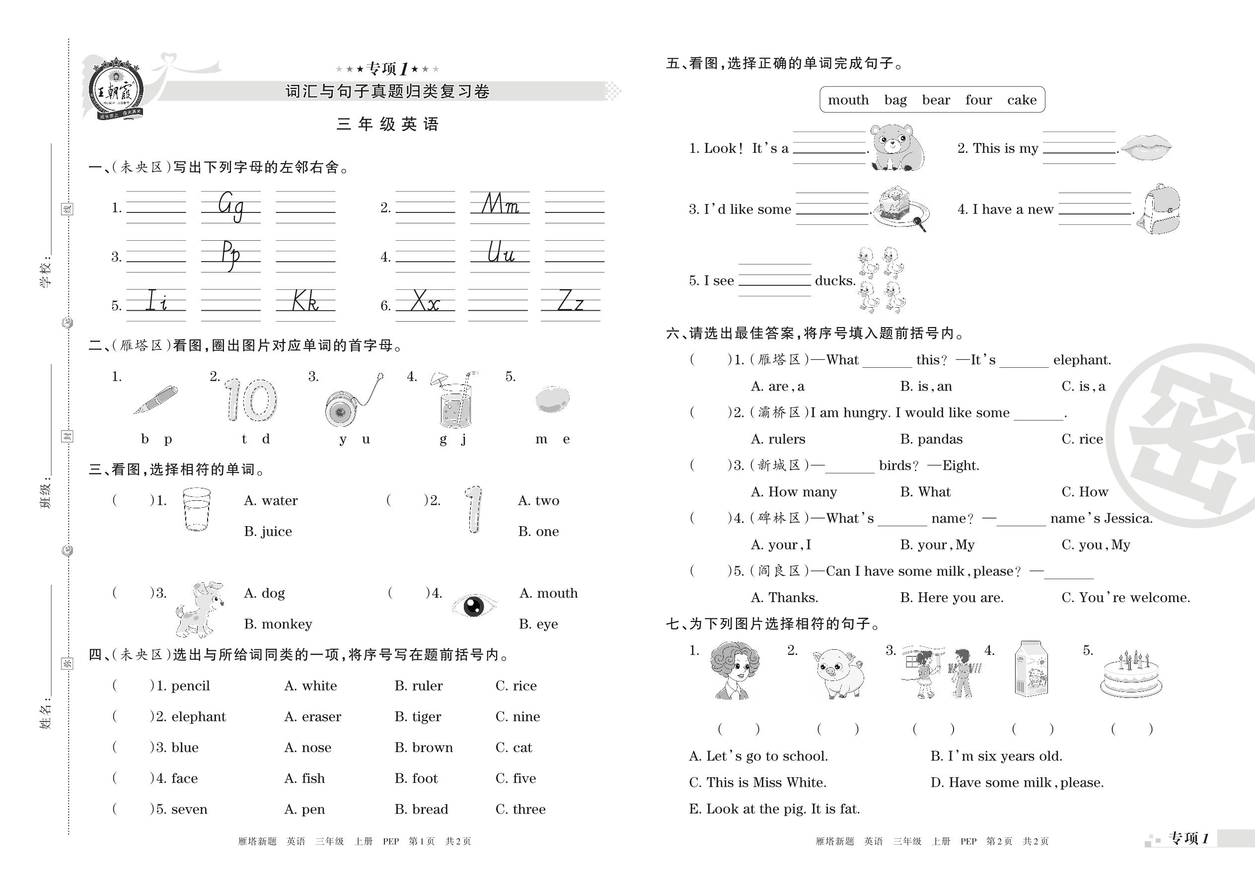 三年级英语人教PEP版(三起始)上册专项卷