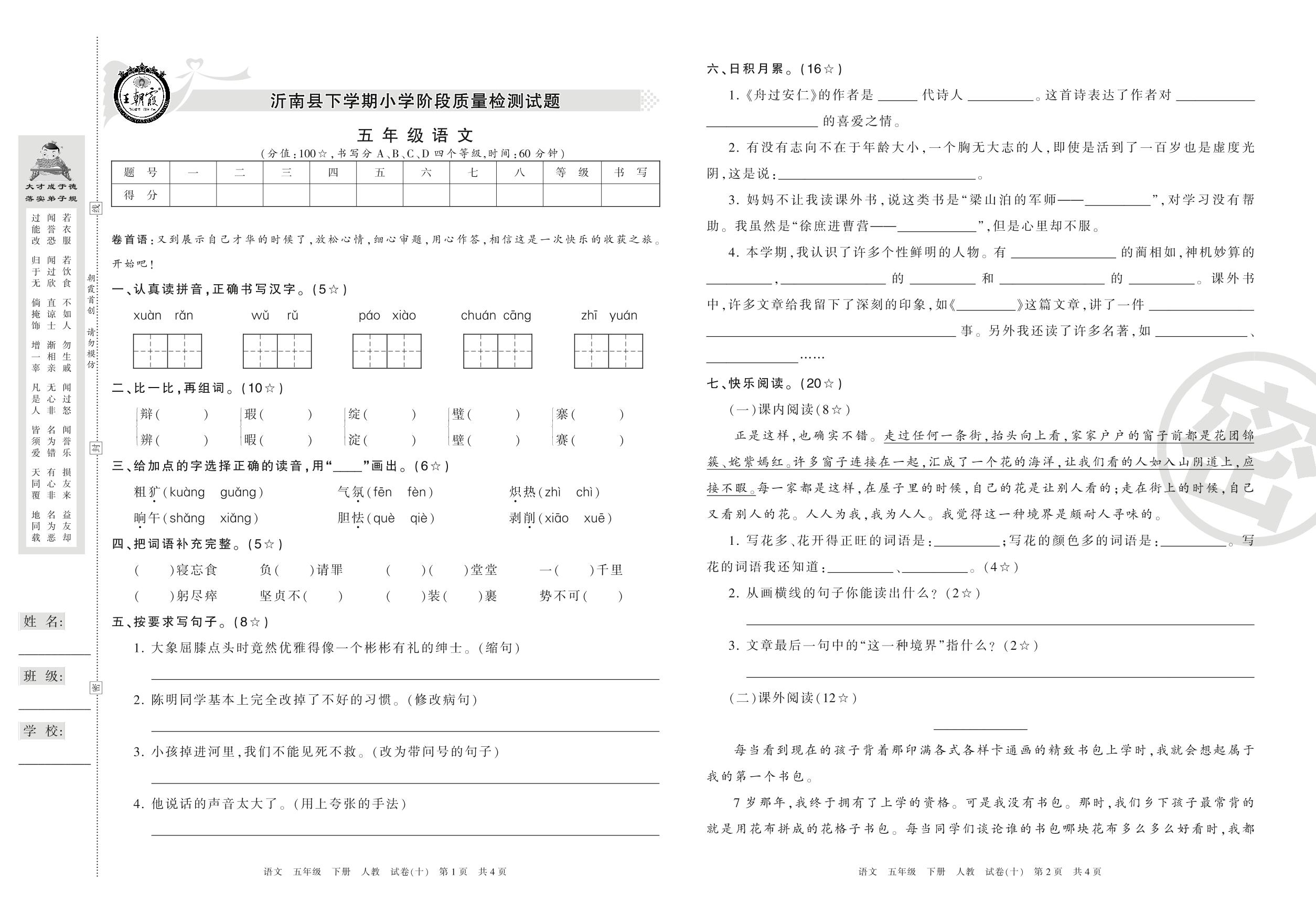 2015-2016学年第二学期临沂市沂南县五年级语文试卷(人教版)【10】