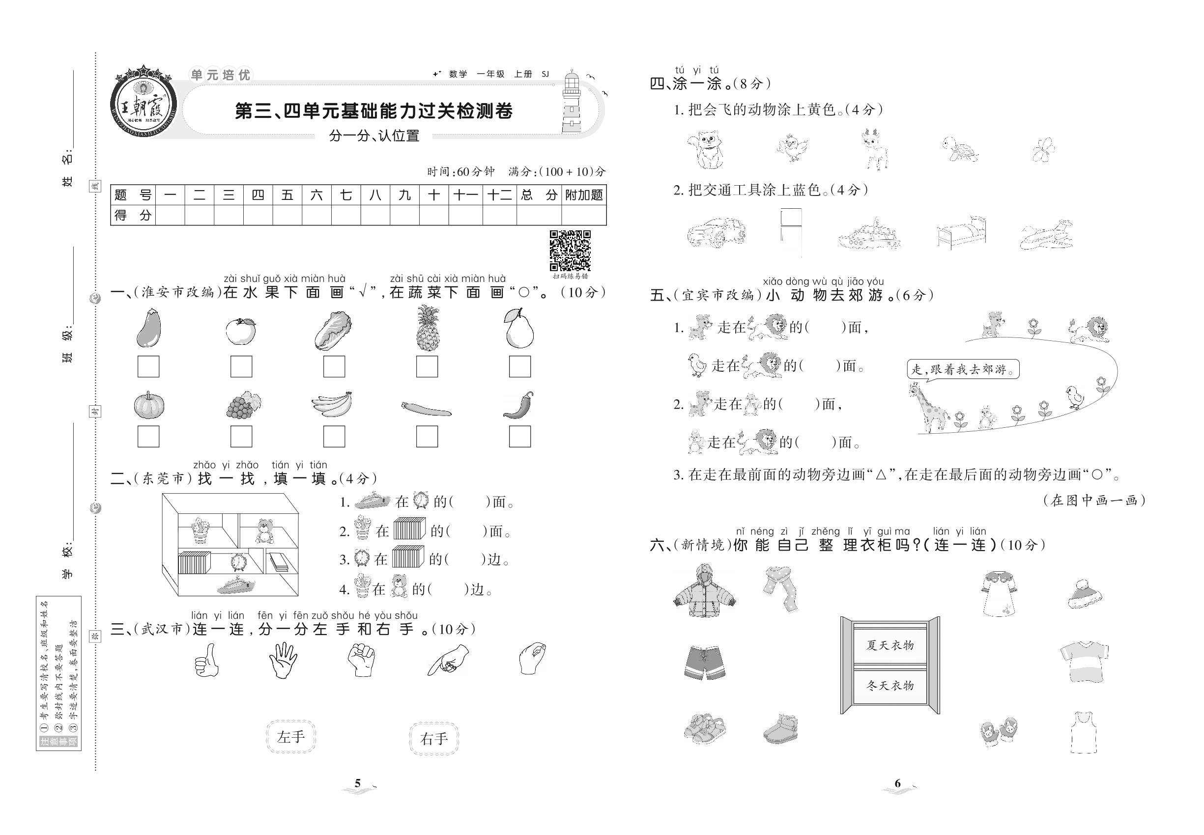 2021上册一年级数学苏教版 第三、四单元 基础能力过关检测卷
