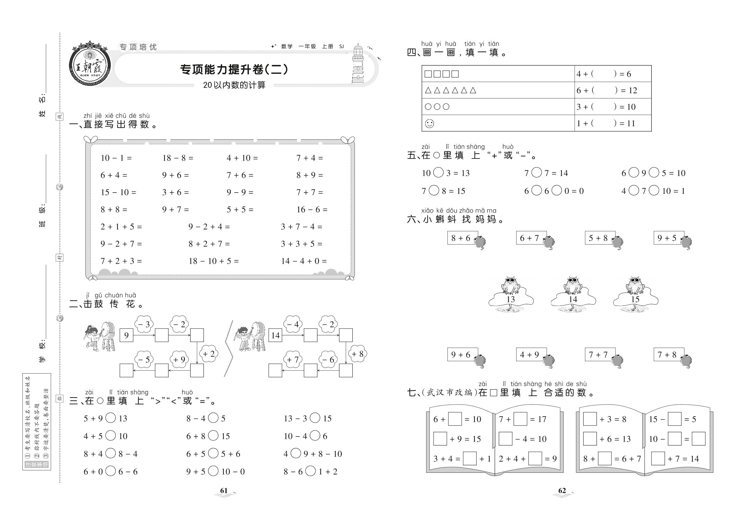 2021上册一年级数学苏教版 专项能力提升卷(二) 20以内数的计算