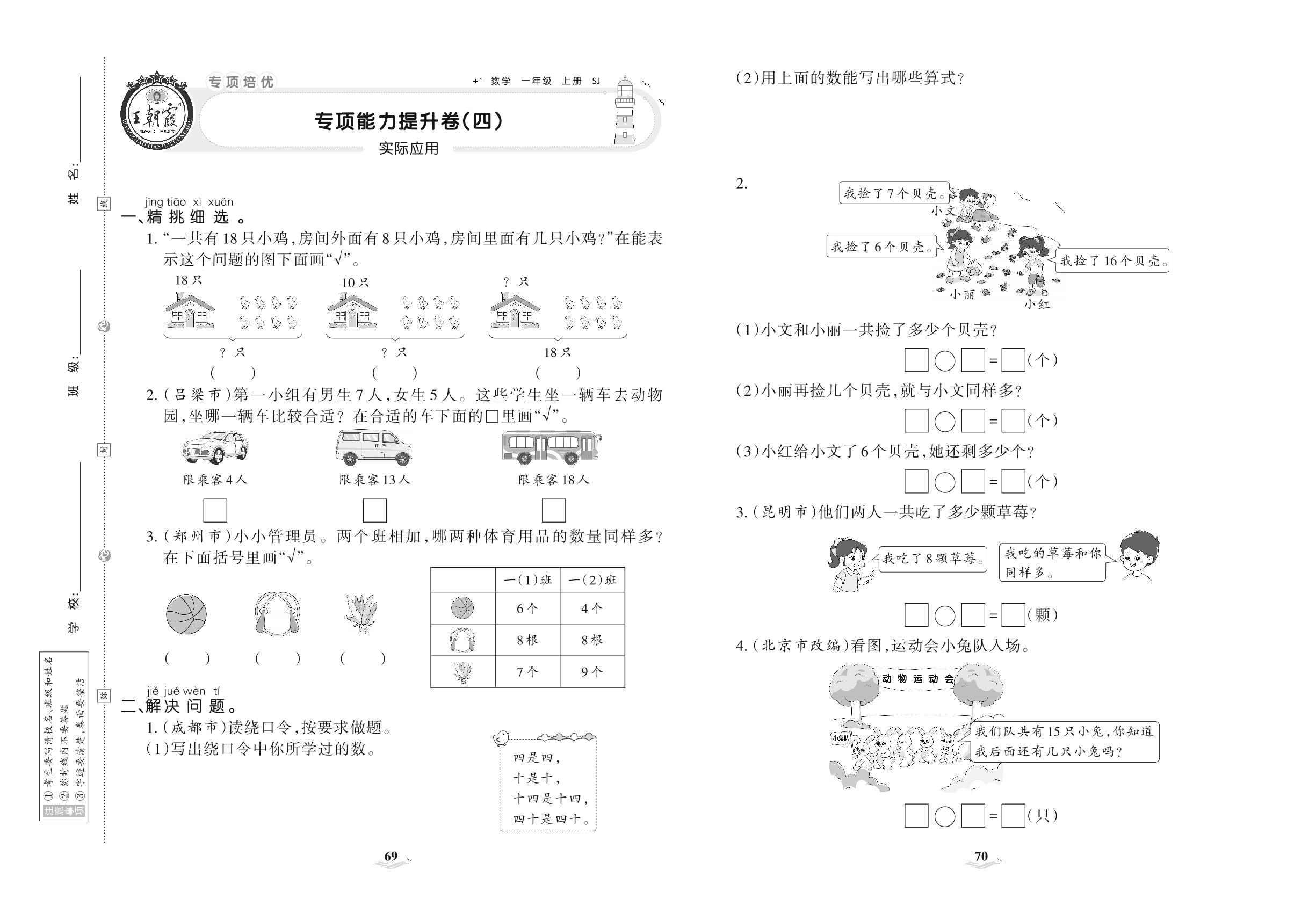 2021上册一年级数学苏教版 专项能力提升卷(四) 实际应用