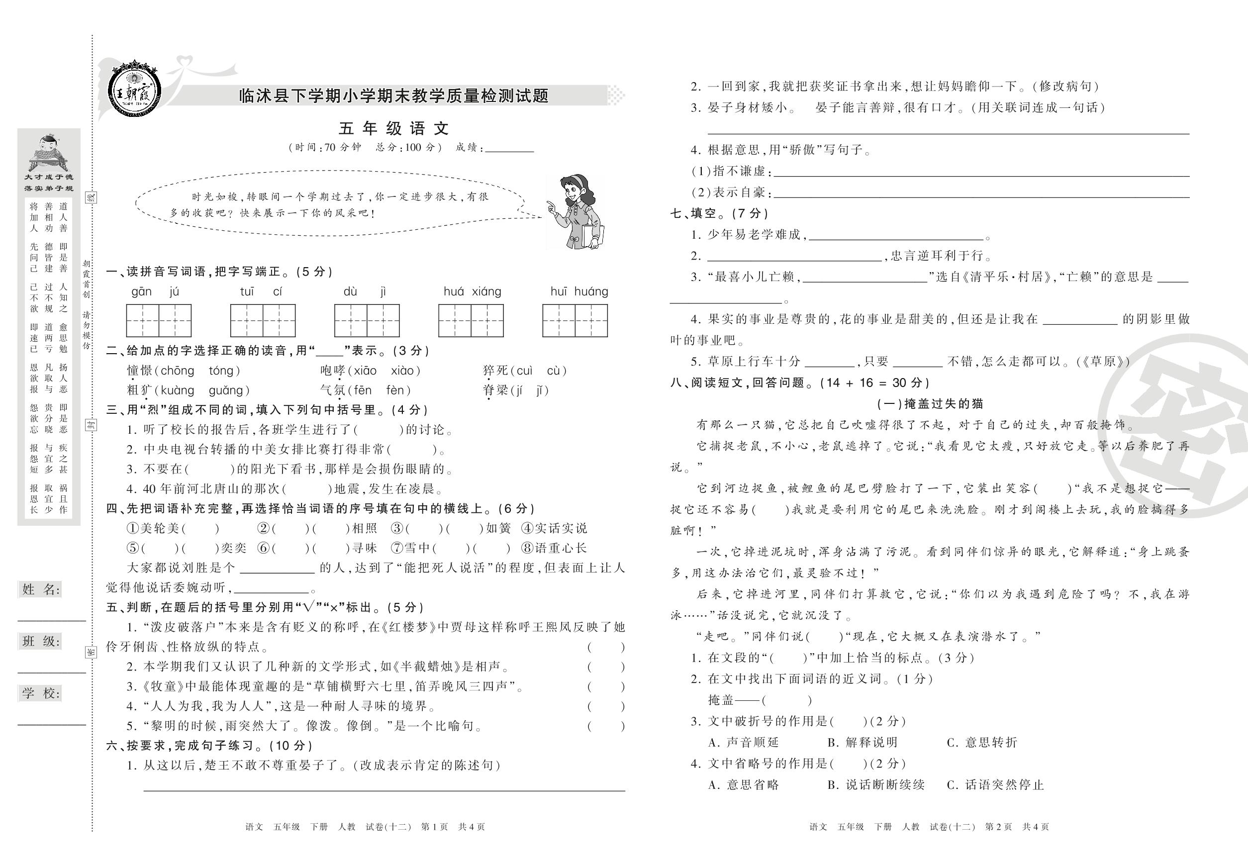 2015-2016学年第二学期临沂市临沭县五年级语文试卷(人教版)【12】