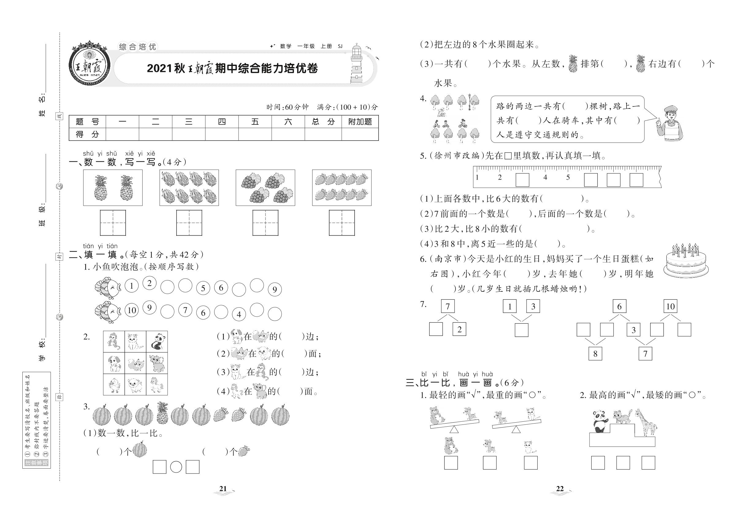 2021上册一年级数学苏教版 王朝霞期中综合能力培优卷