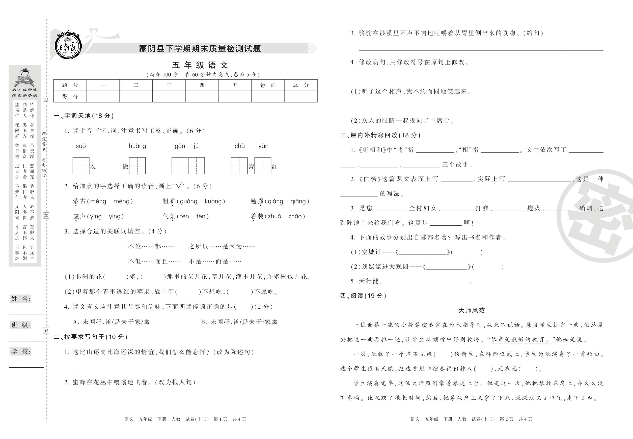 2015-2016学年第二学期临沂市蒙阴县五年级语文试卷(人教版)【13】