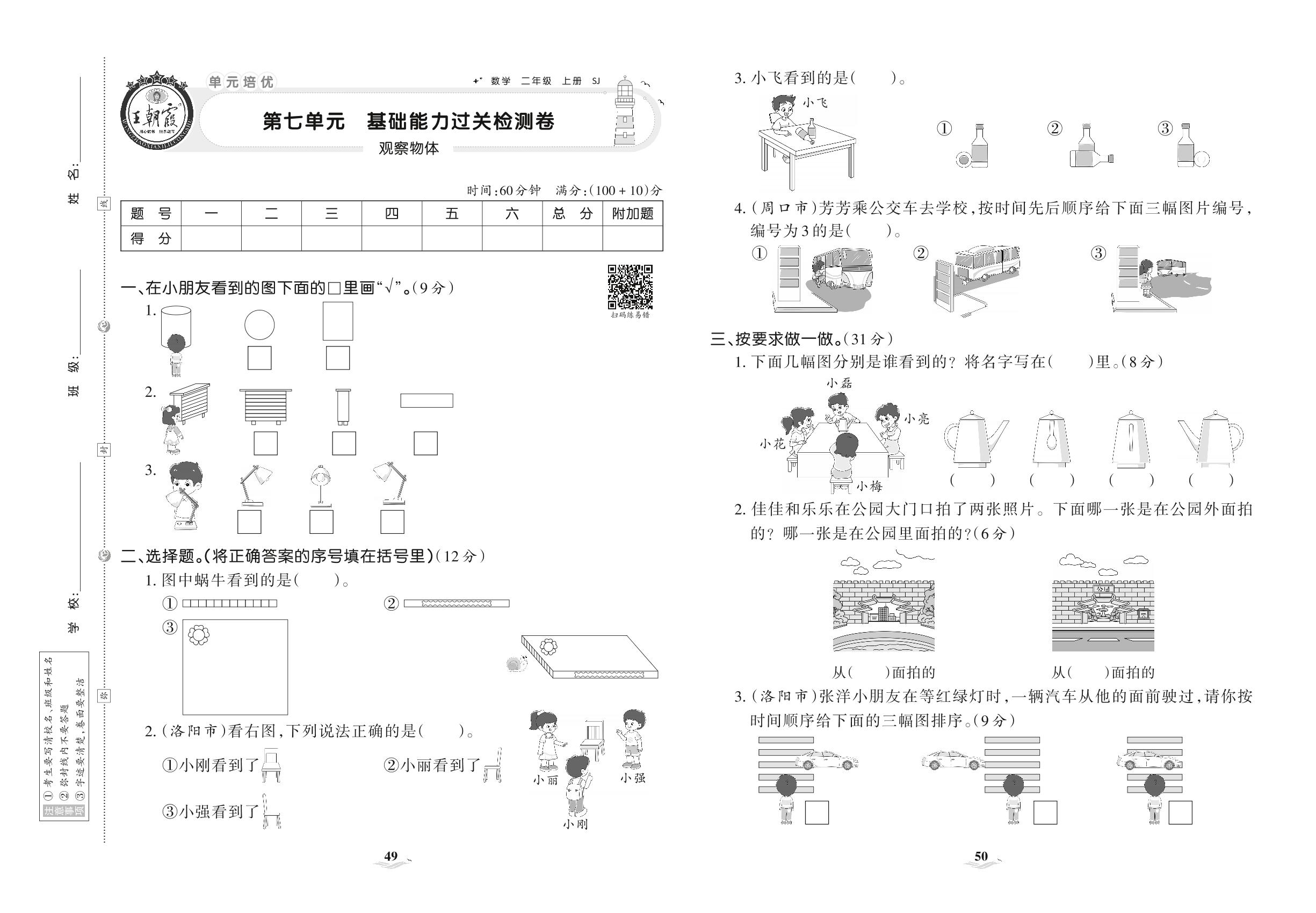 2021上册二年级数学苏教版 第七单元 基础能力过关检测卷