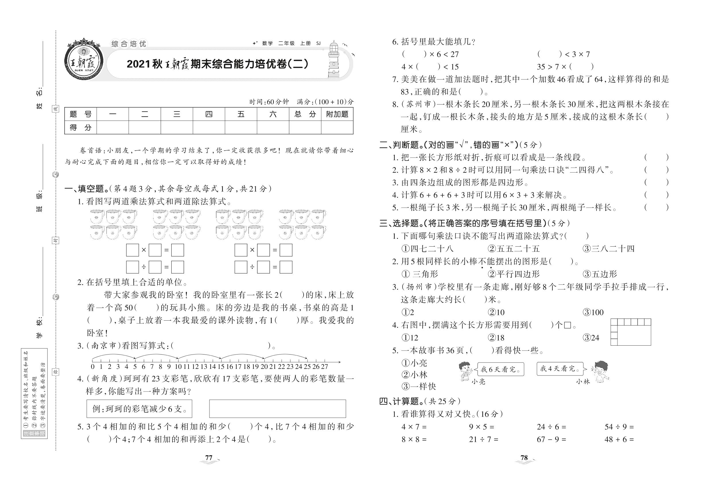 2021上册二年级数学苏教版 王朝霞期末综合能力培优卷(二)