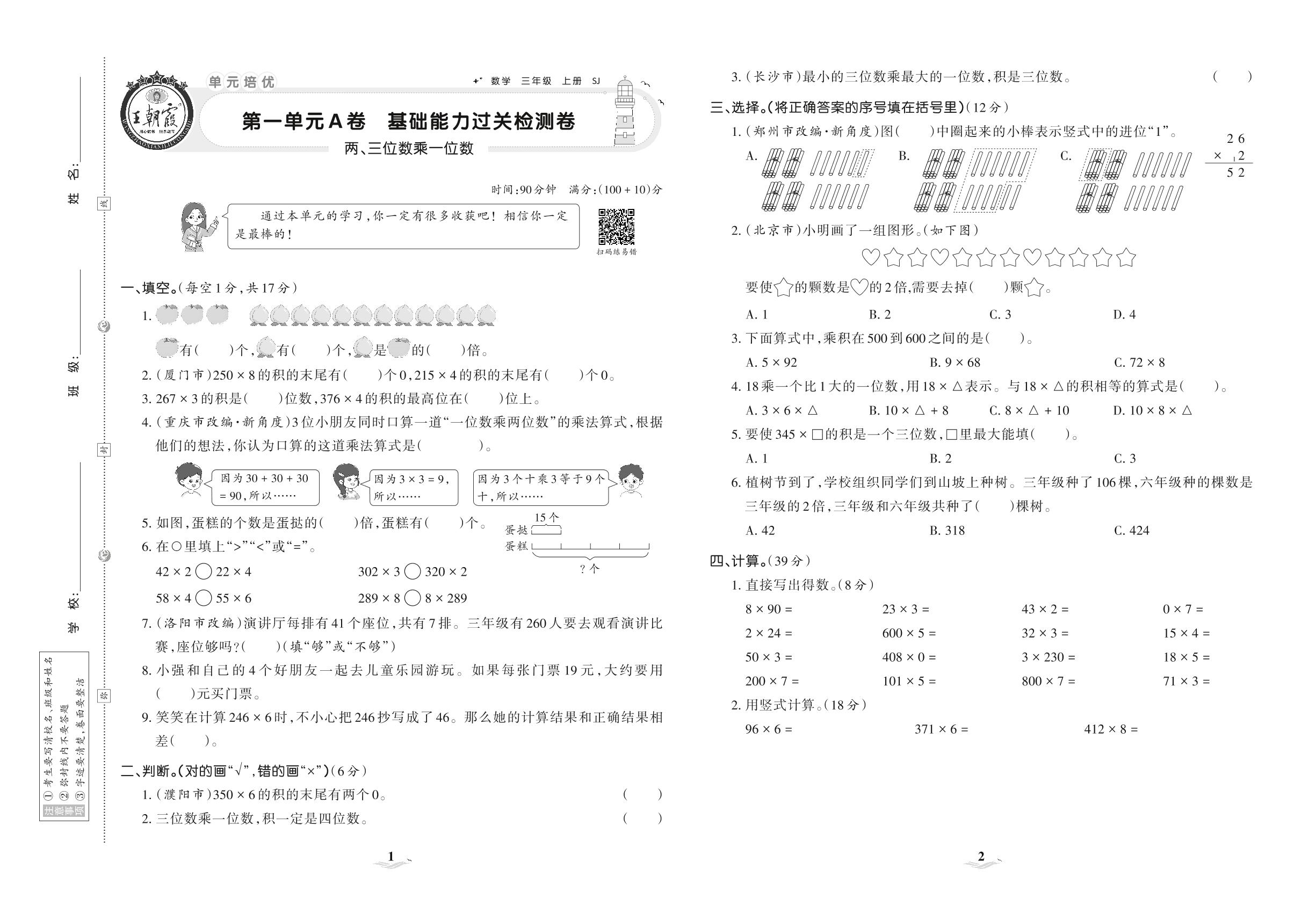 2021上册三年级数学苏教版 第一单元A卷 基础能力过关检测卷