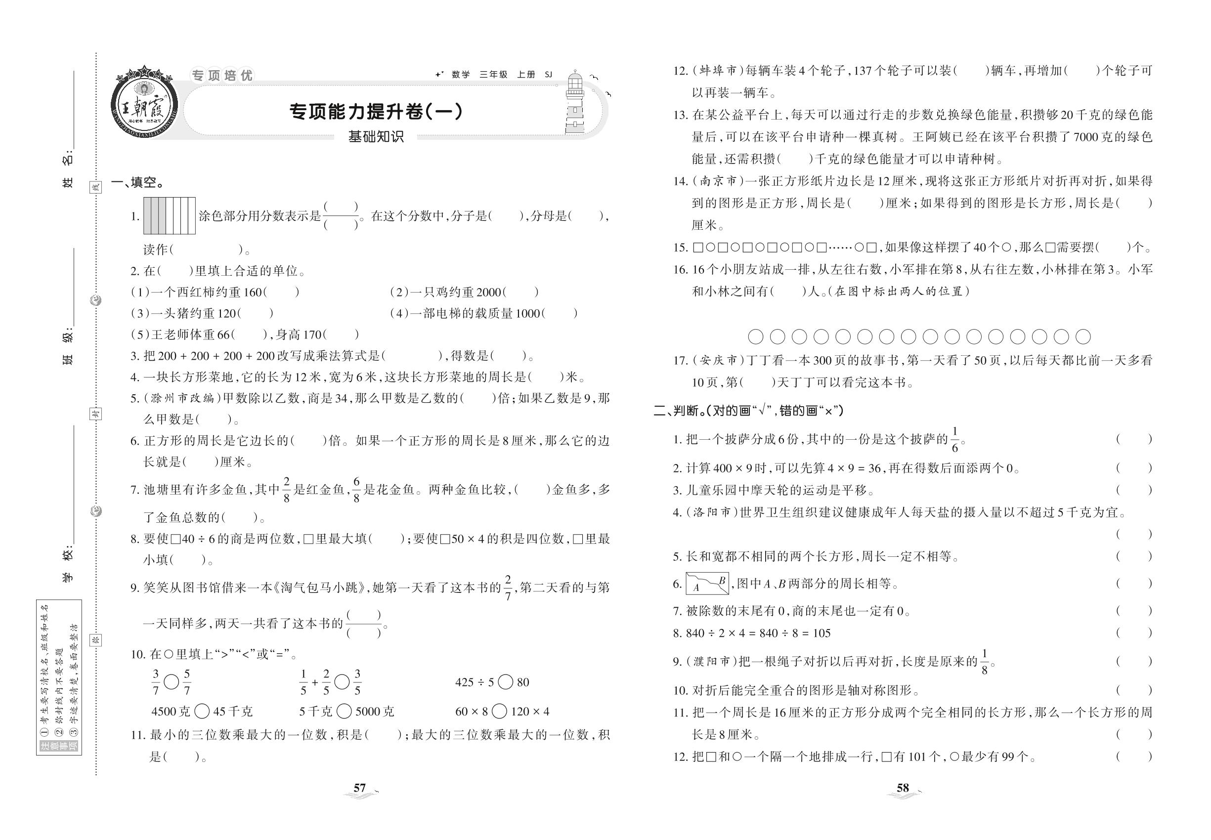 2021上册三年级数学苏教版 专项能力提升卷(一) 基础知识