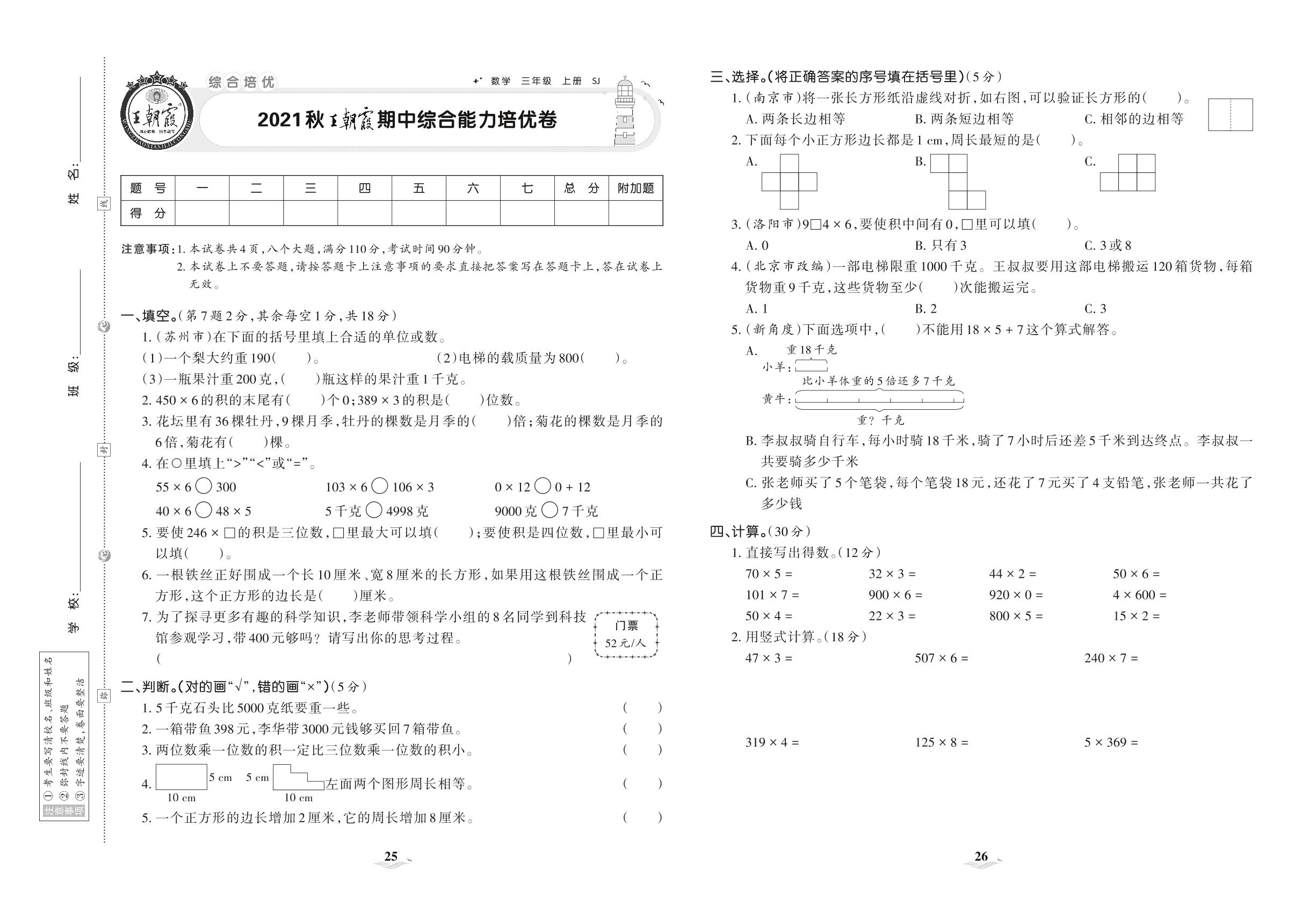 2021上册三年级数学苏教版 王朝霞期中综合能力培优卷