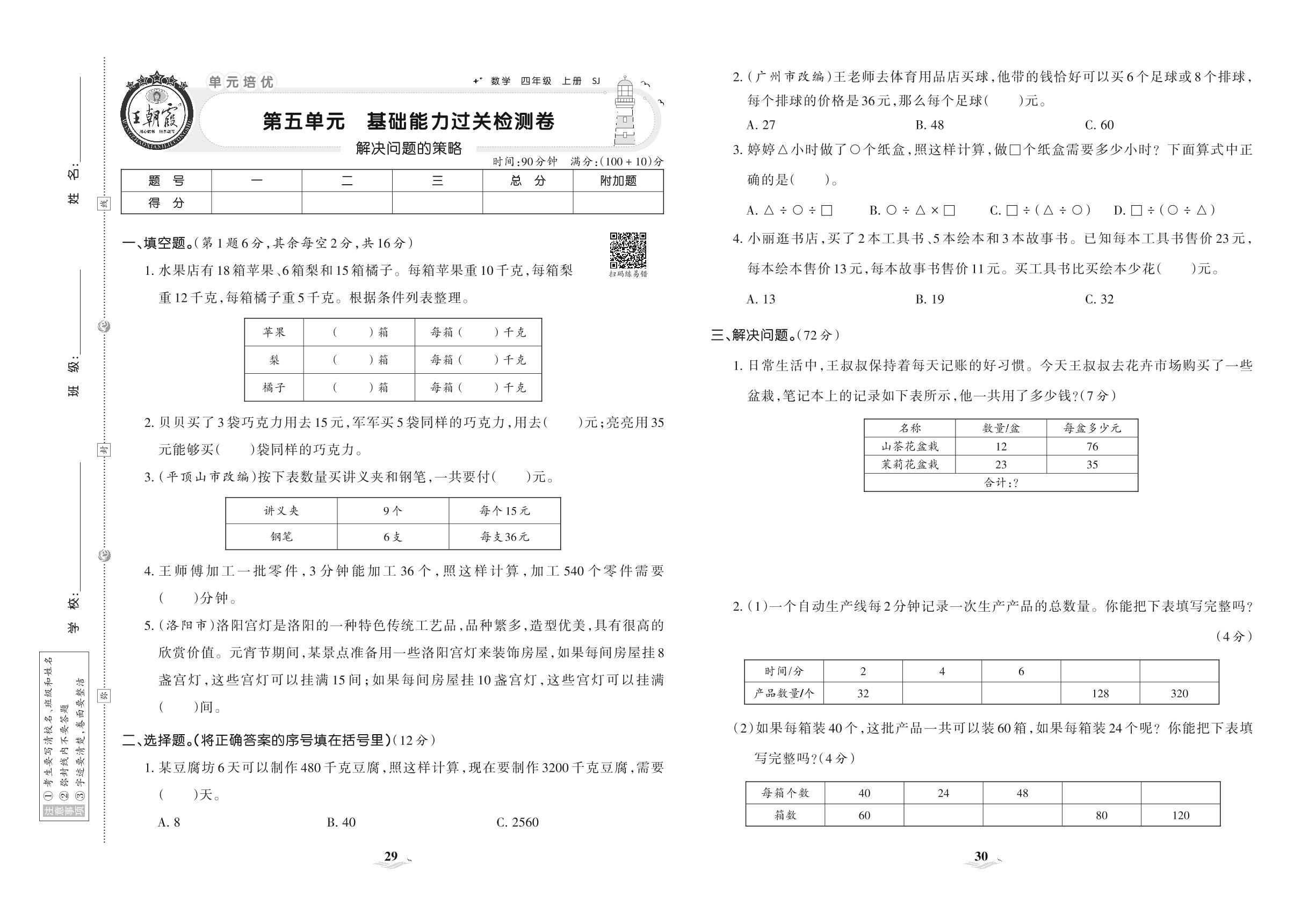 2021上册四年级数学苏教版 第五单元 基础能力过关检测卷