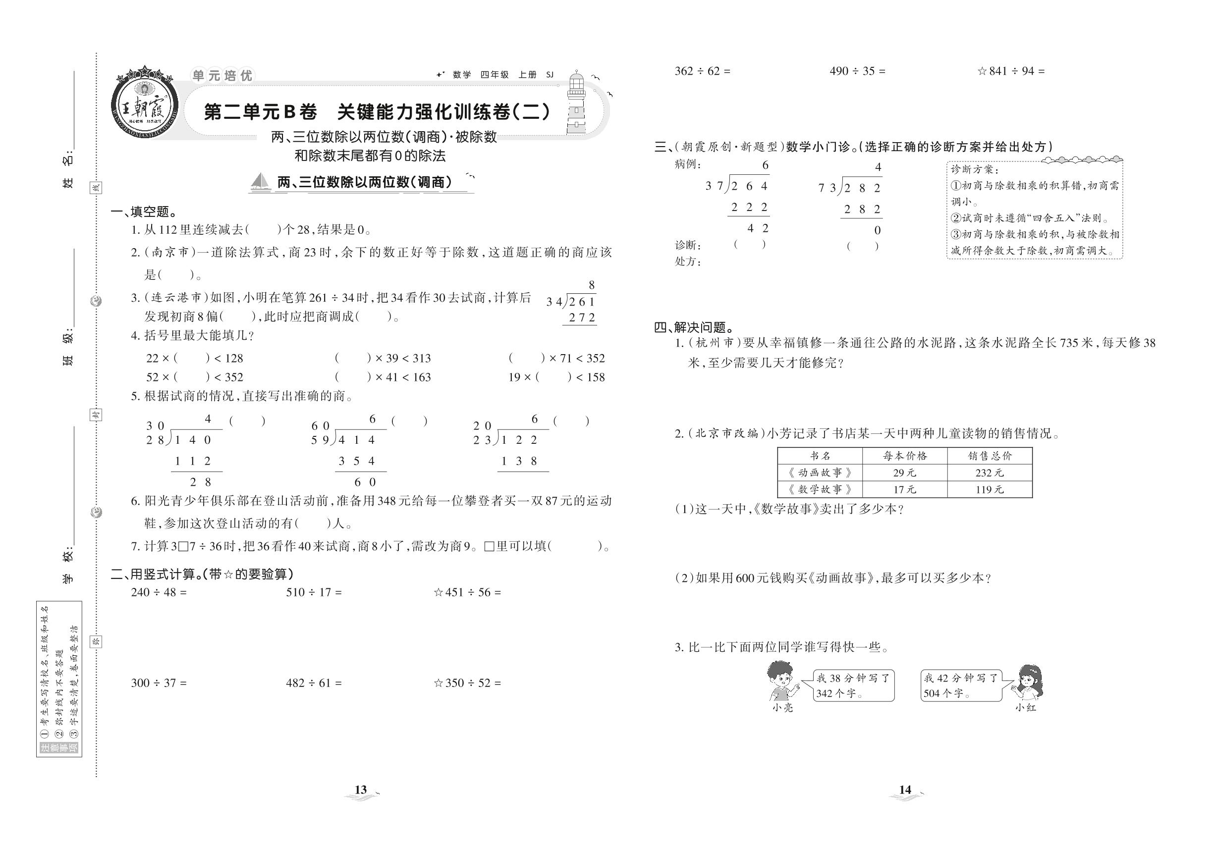 2021上册四年级数学苏教版 第二单元B卷 关键能力强化训练卷(二)