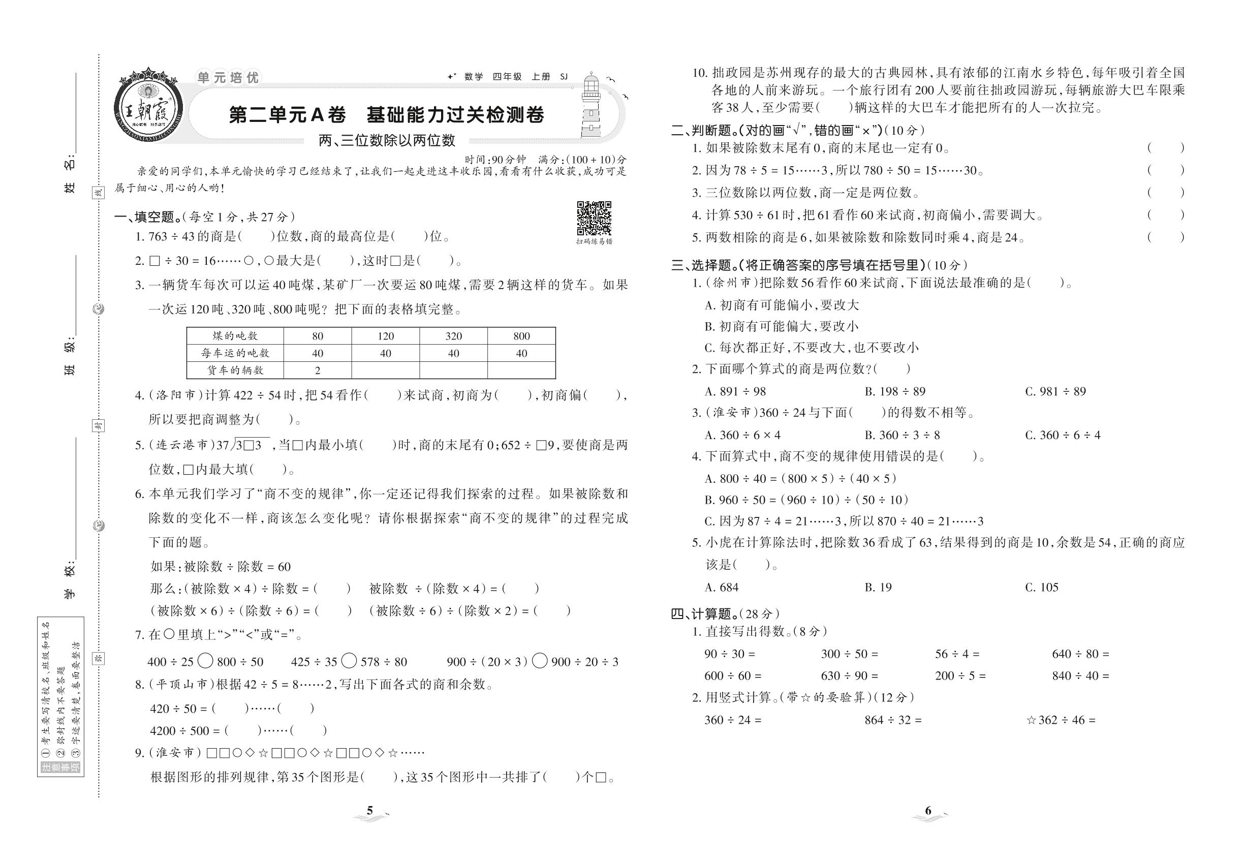 2021上册四年级数学苏教版 第二单元A卷 基础能力过关检测卷