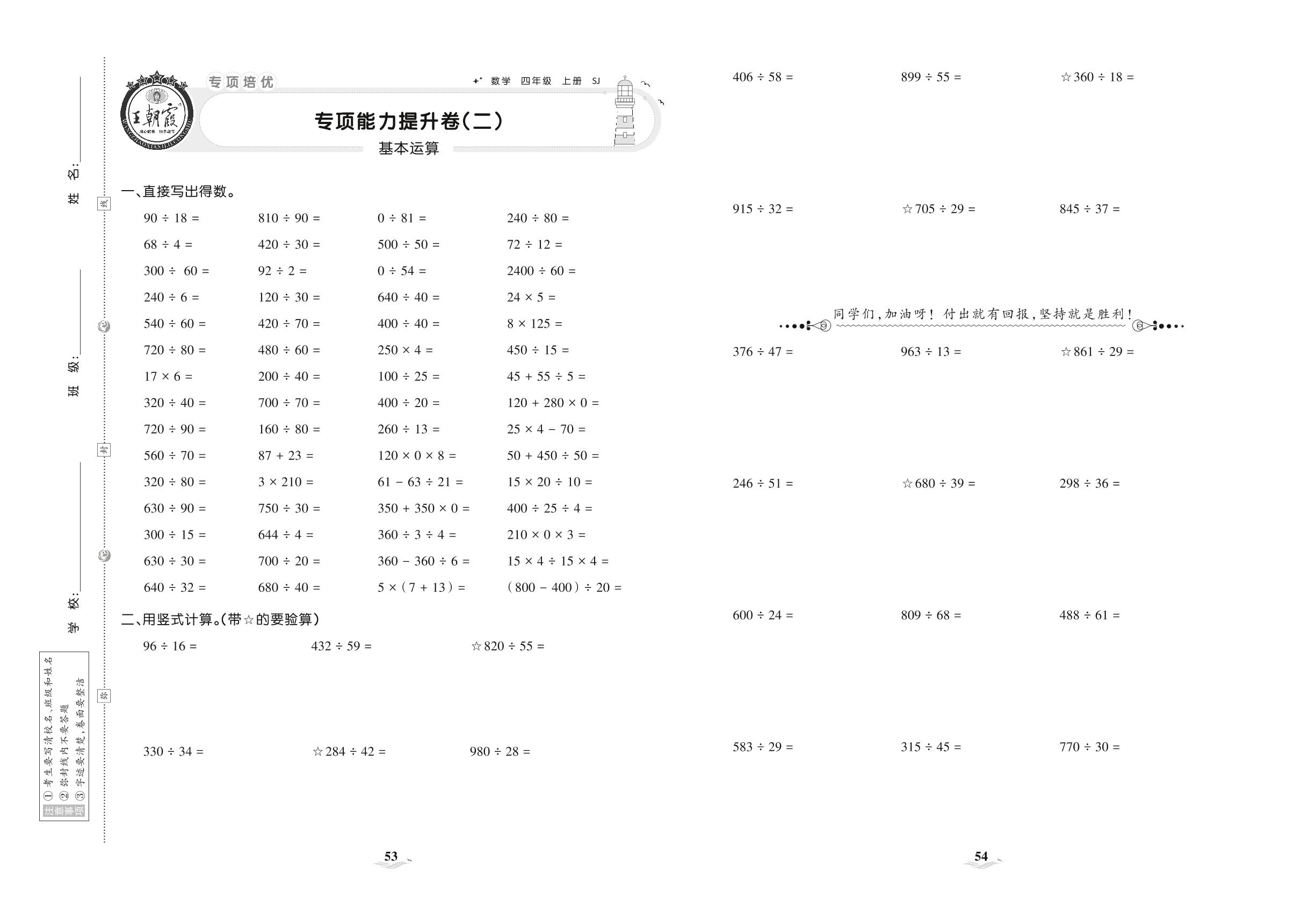2021上册四年级数学苏教版 专项能力提升卷(二) 基本运算
