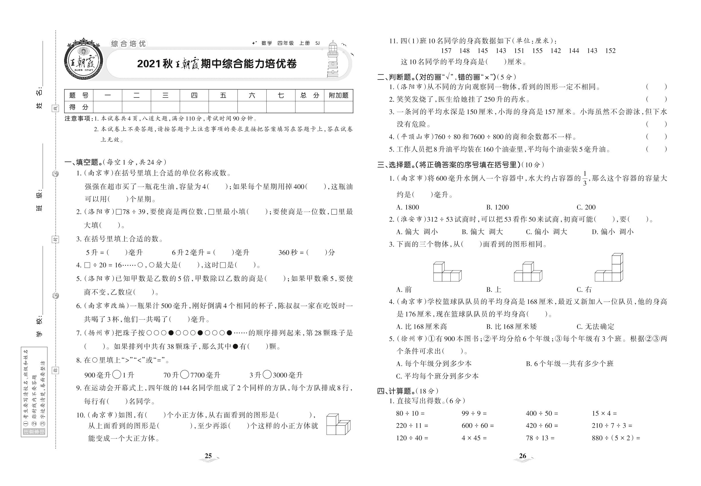 2021上册四年级数学苏教版 王朝霞期中综合能力培优卷
