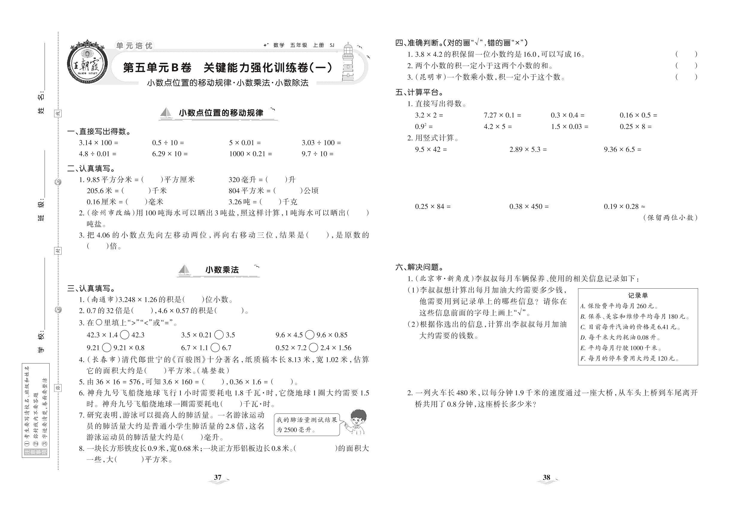 2021上册五年级数学苏教版 第五单元B卷 关键能力强化训练卷(一)